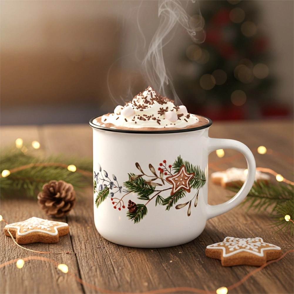 Motivet med nålegrene, røde bær og en honningkage-stjerne forvandler hver tår til et lille vinterritual – ideelt til afslapning med te eller varm chokolade.