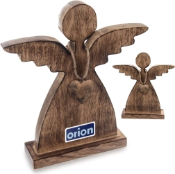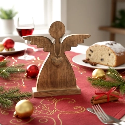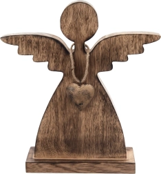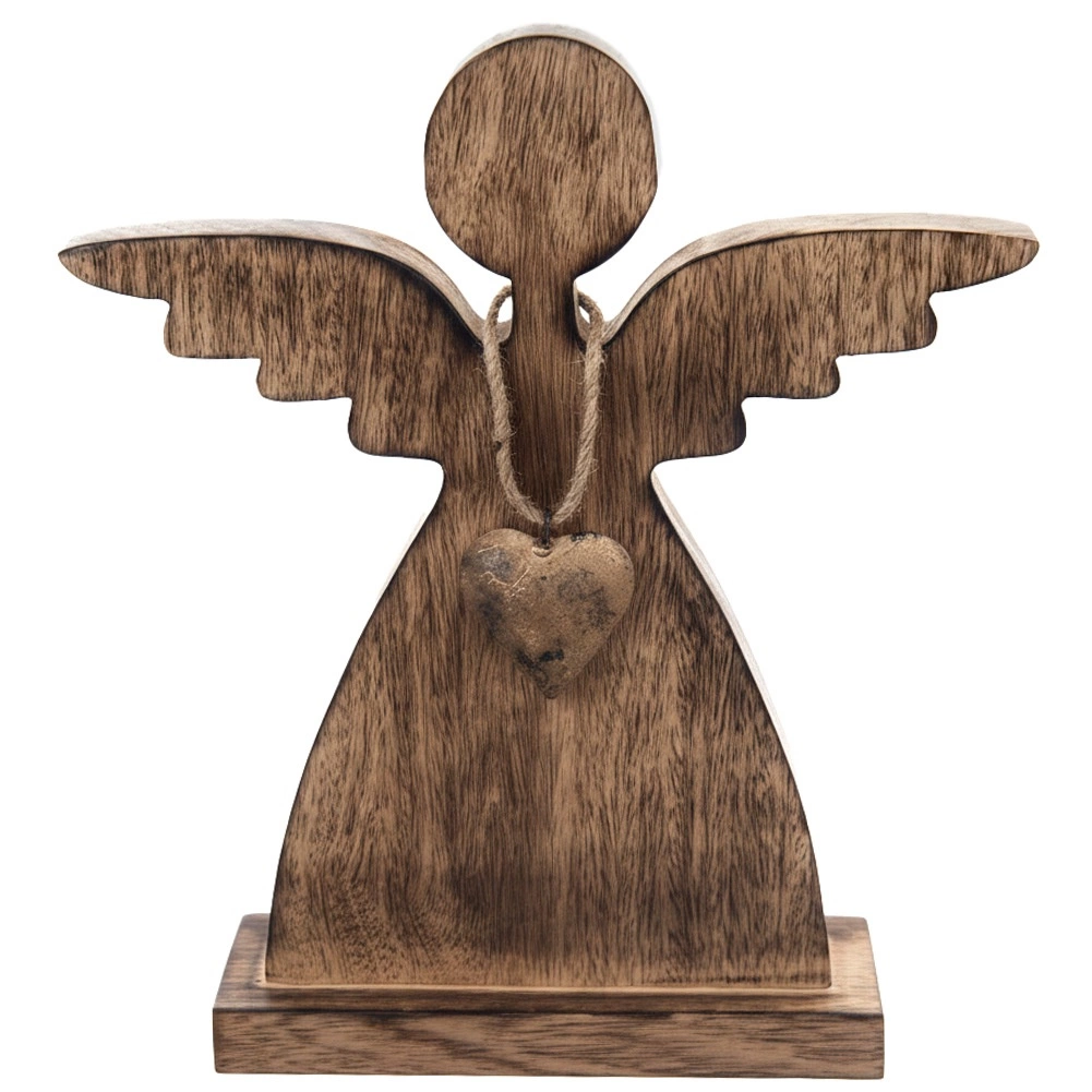Denne engel i naturligt mangotræ bringer ro og hygge ind i hjemmet. De minimalistiske linjer, de fint stiliserede vinger og det lille metalhjerte i gylden farve udgør en tidløs kombination, der passer til både moderne og rustikke interiører. Den stabile base garanterer sikker placering på bord, hylde eller kommode.