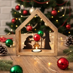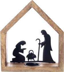 Den elegante lysestage med motiv af den Hellige Familie kombinerer massivt mangotræ med sorte metalsilhuetter. Når tealightet tændes, skaber den et blidt, varmt lys, som smukt fremhæver krybbens linjer og giver en magisk julestemning.