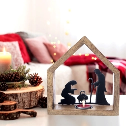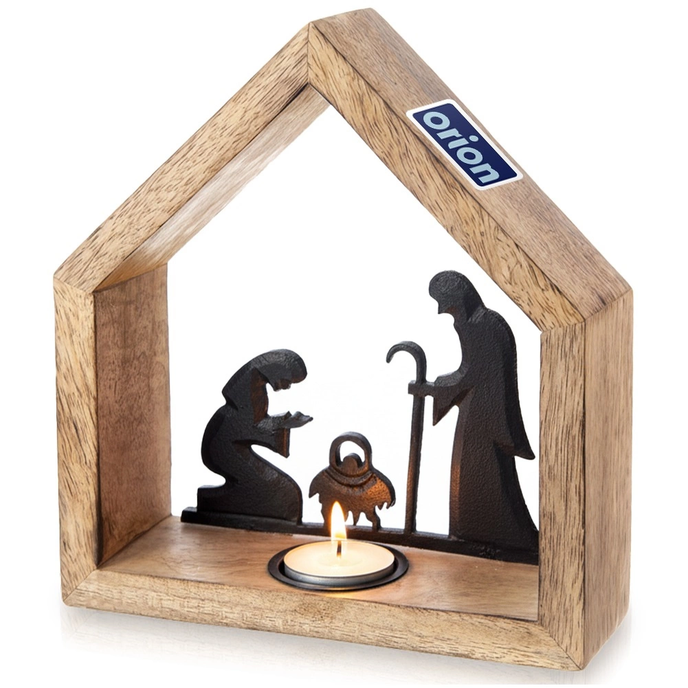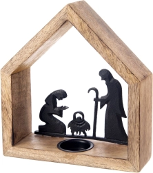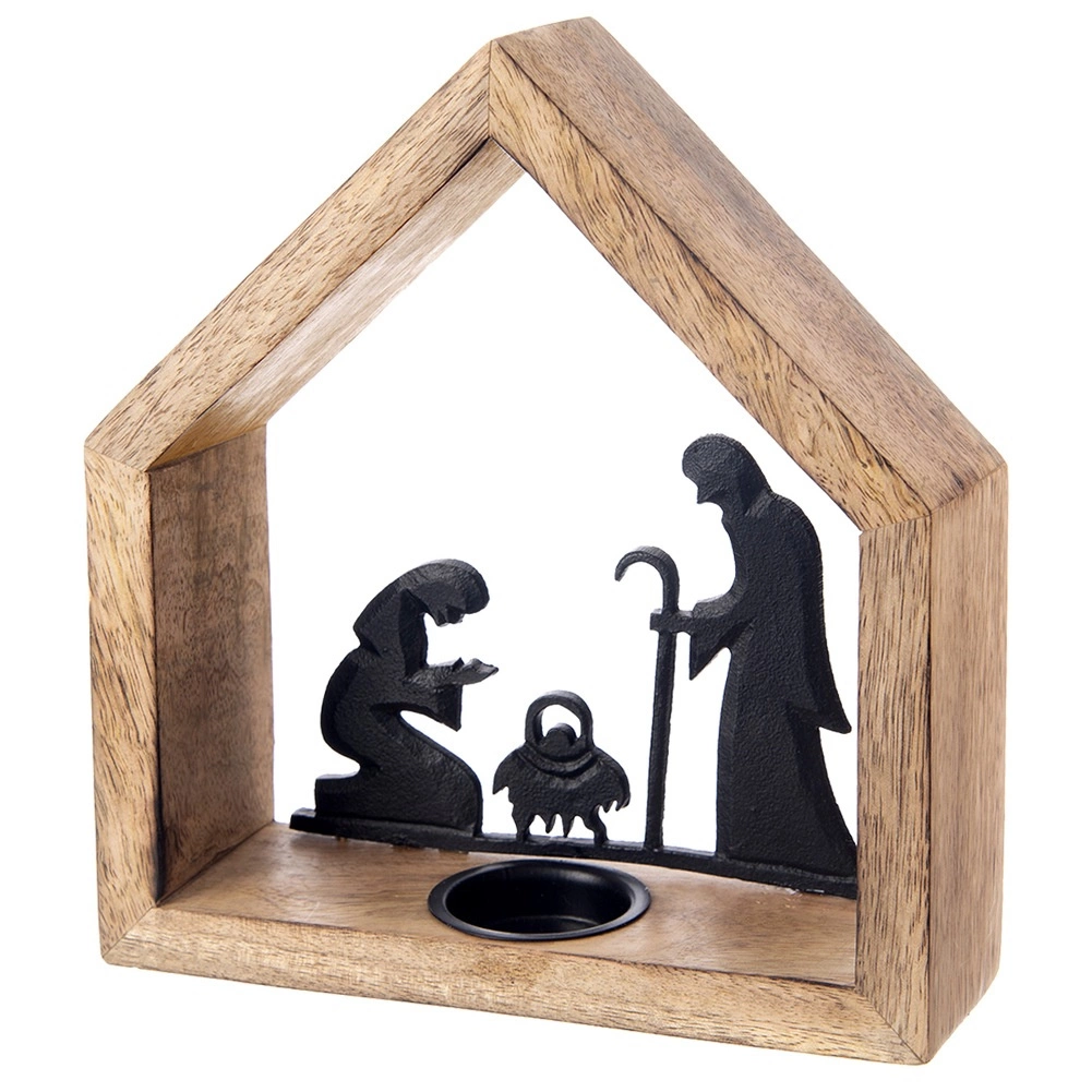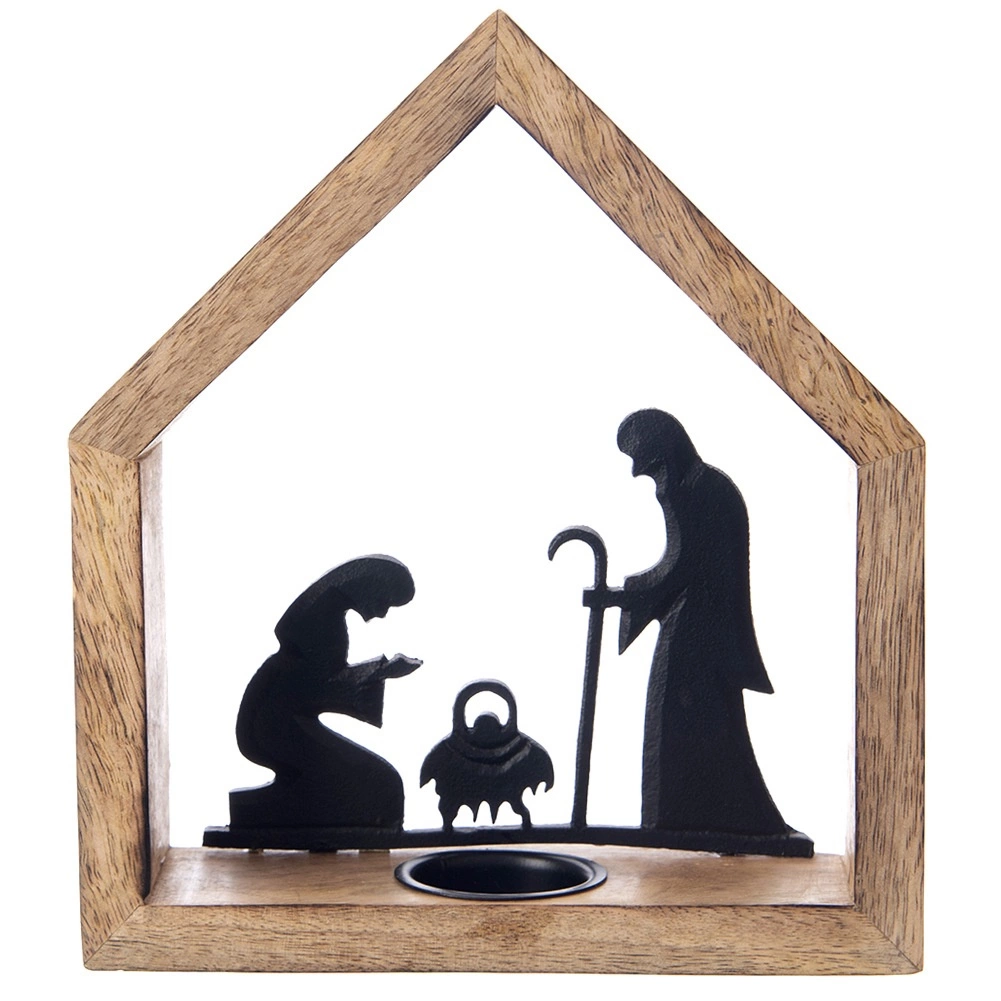 En stilfuld lysestage formet som et lille hus med krybbemotiv i naturligt mangotræ og sort metal bringer en varm, festlig atmosfære ind i hjemmet. Den har en fræset åbning til et fyrfadslys (tealight) op til 4 cm i diameter, en stabil base og et rustikt design, der gør sig godt på bordet, kommoden eller vindueskarmen.
