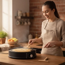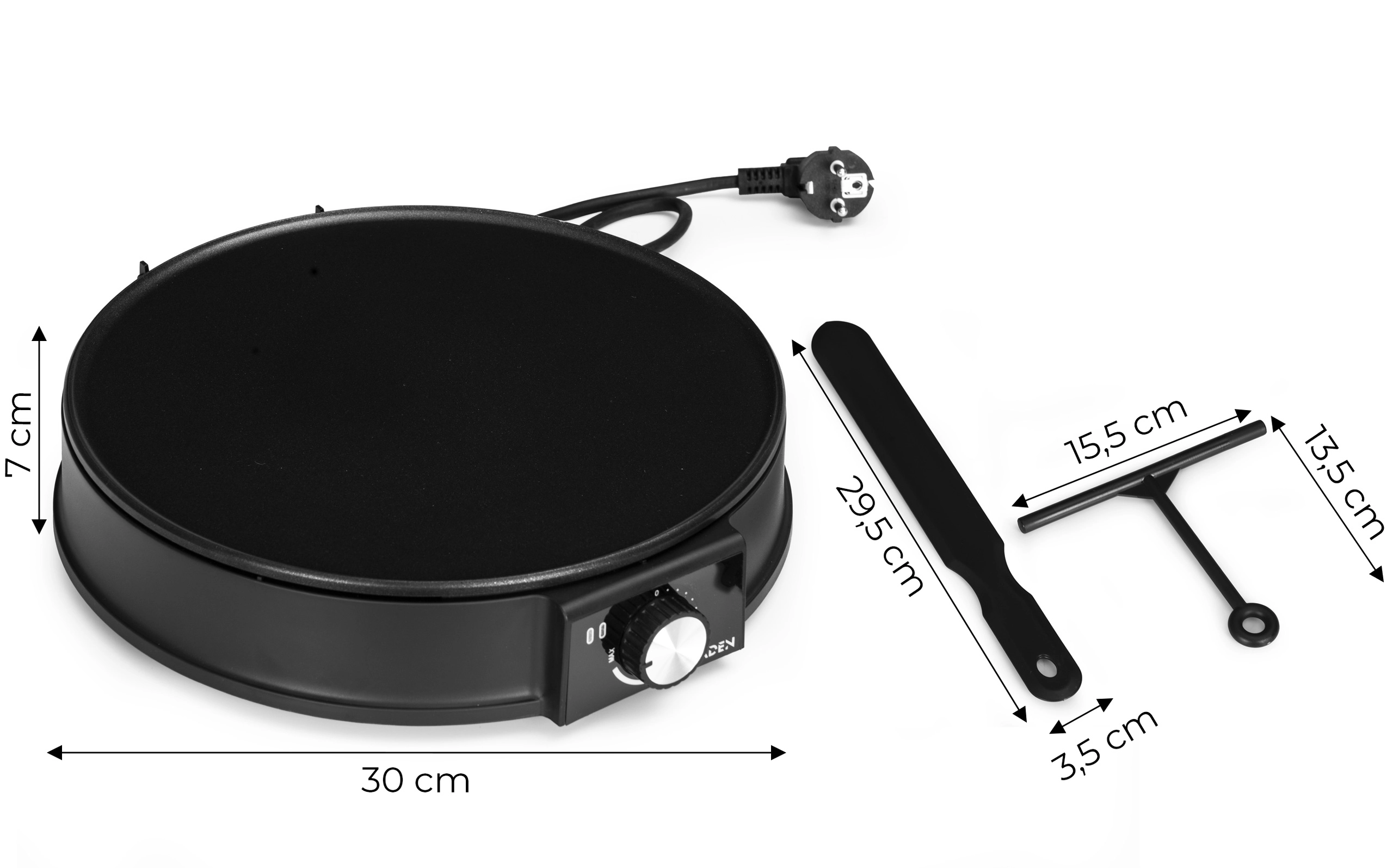 Diameteren på 30 cm giver rigelig plads til store pandekager. I pakken finder du en vendespatel og en T-formet dejfordeler for et professionelt resultat.