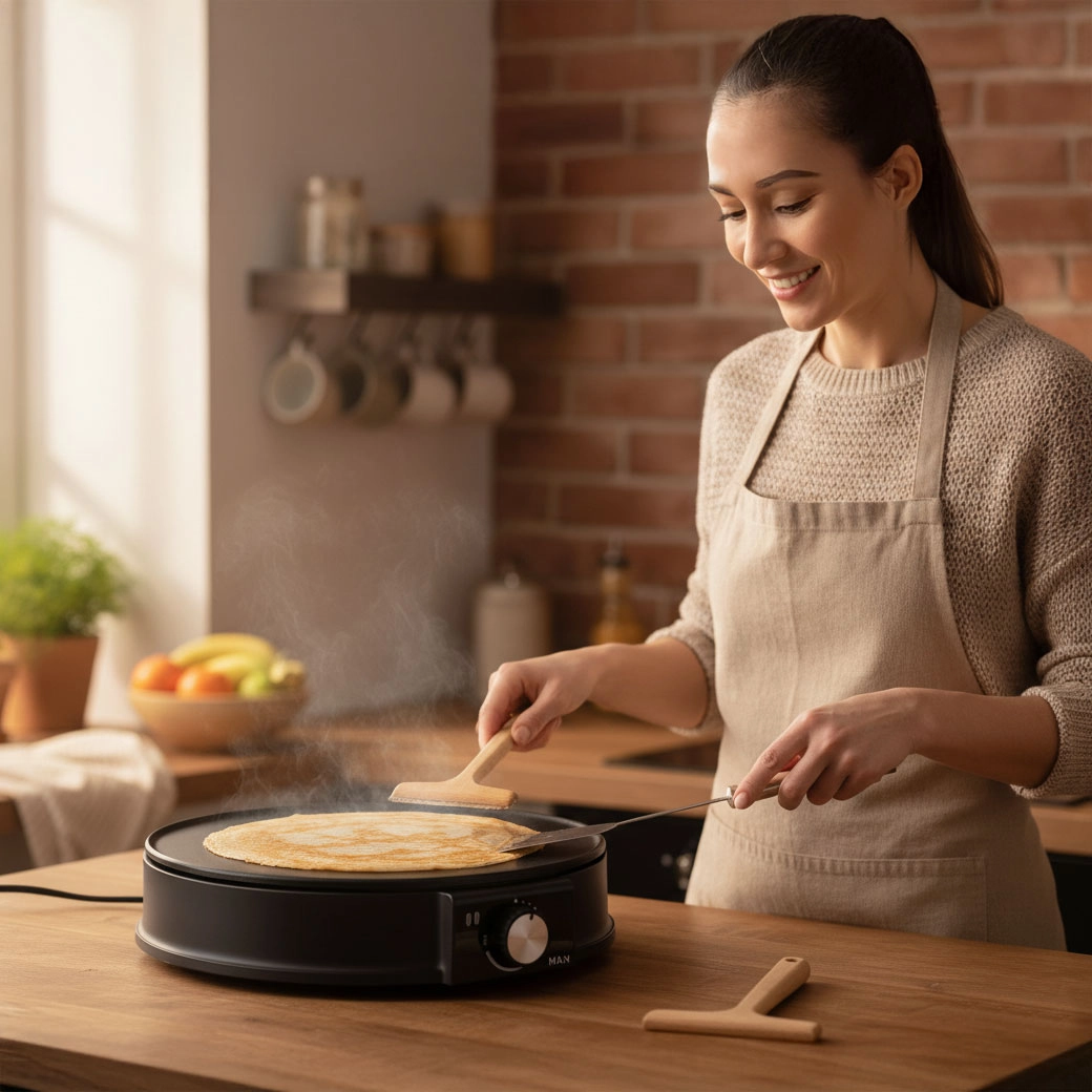 Drejeknapsregulator og driftsindikatorer giver præcis kontrol over temperaturen til tynde crêpes og gyldne små pandekager.
