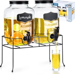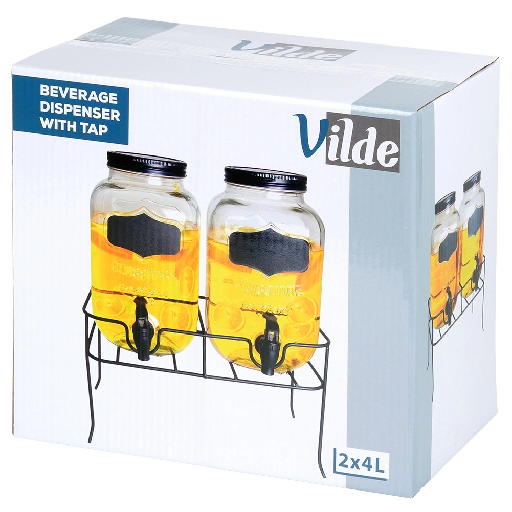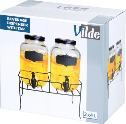 Dette praktiske sæt med to drikkedispensere bringer orden og stil til enhver servering. Hver glasbeholder har en kapacitet på 4 l og er udstyret med en plastikhane med tætning for jævn udskænkning. Takket være den brede åbning er det nemt at fylde frugt eller isterninger i, og låget beskytter drikken mod insekter og snavs. Den tavleagtige flade på forsiden gør det muligt at skrive med kridt.