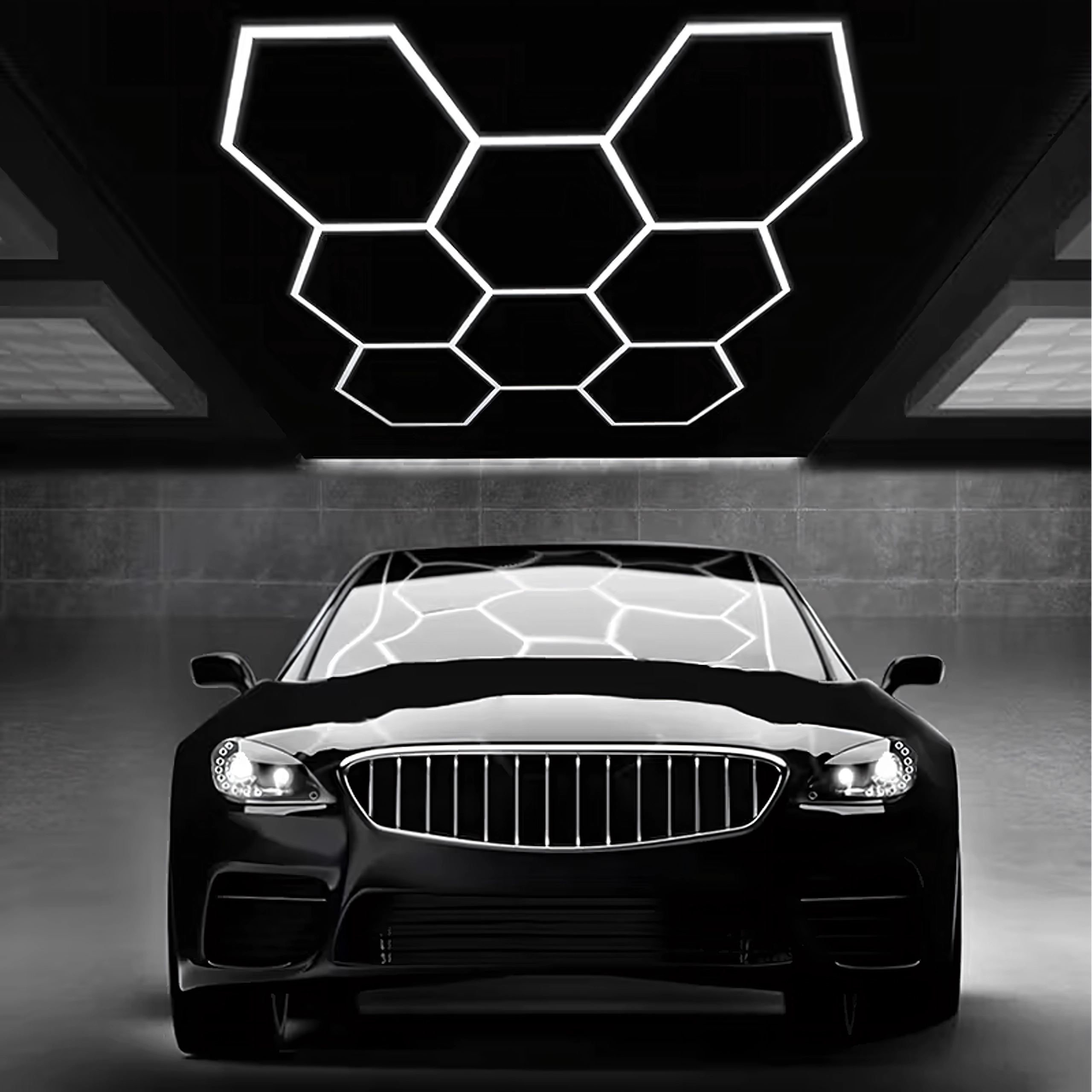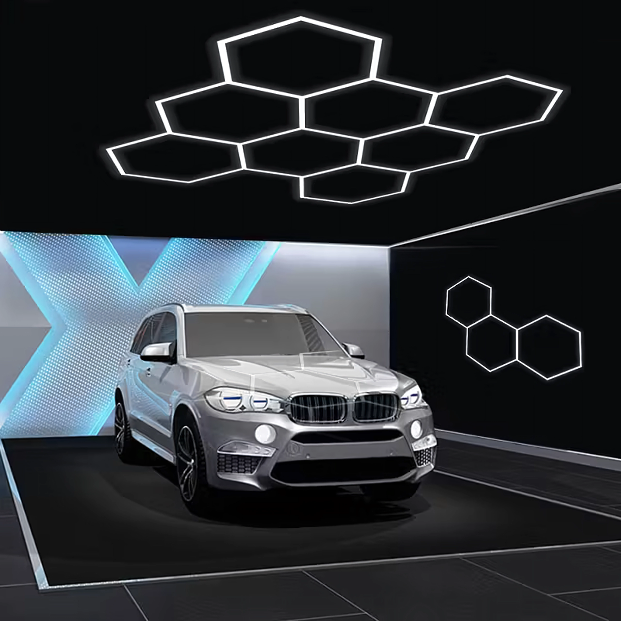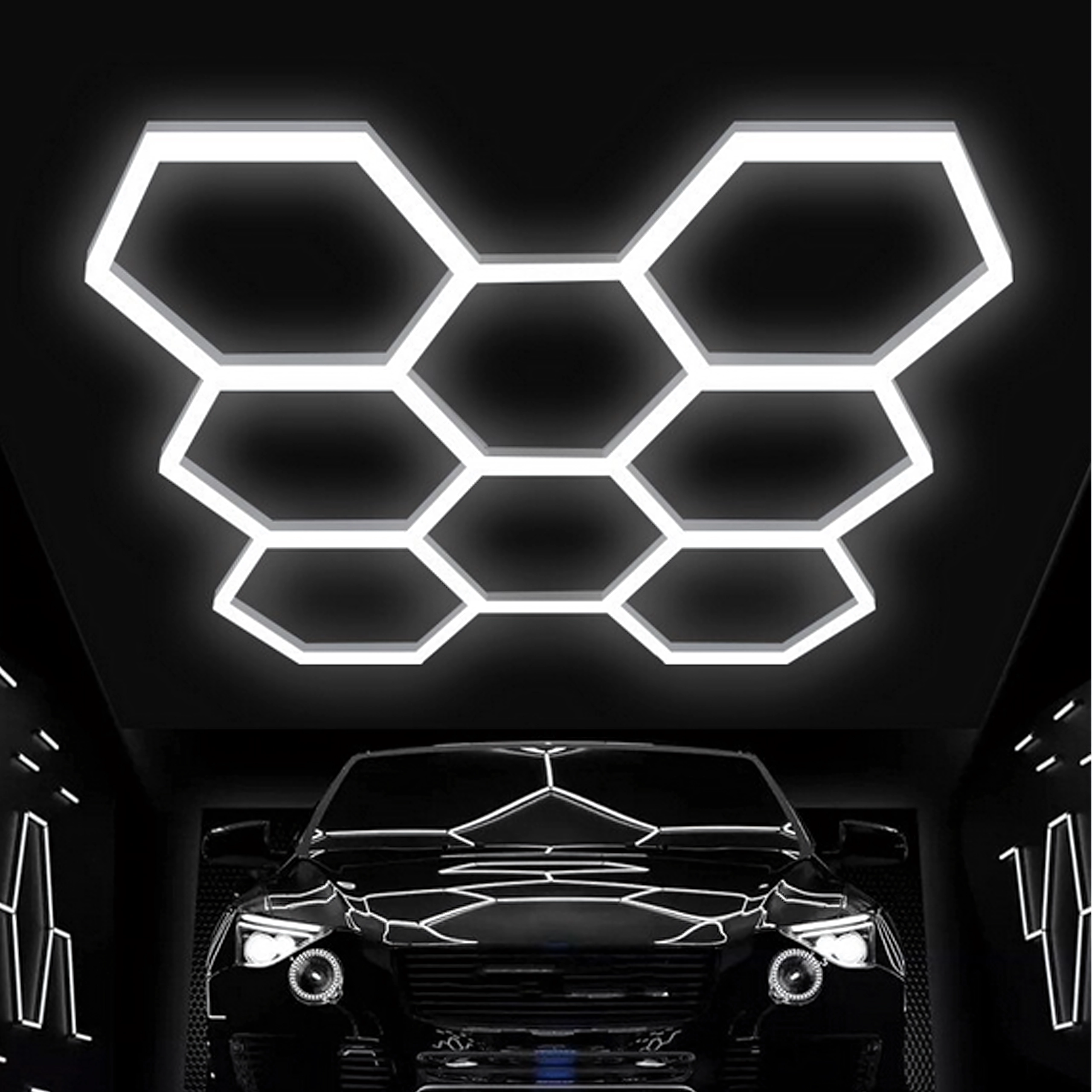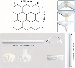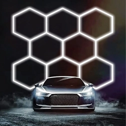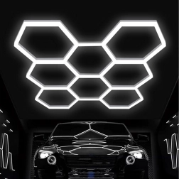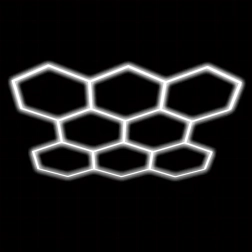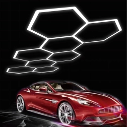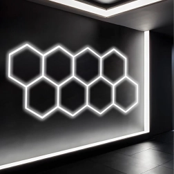 Bring moderne design og perfekt belysning ind i dit rum. Det modulære hexagonale LED-system med mål på 257 × 244 cm og en effekt på 280 W leverer klart hvidt lys på 6500K, ideelt til garage, værksted, detailing-studie, kontor og hjemmeinteriør. Det stilfulde “bikube”-mønster sikrer jævn belysning og et attraktivt udseende.