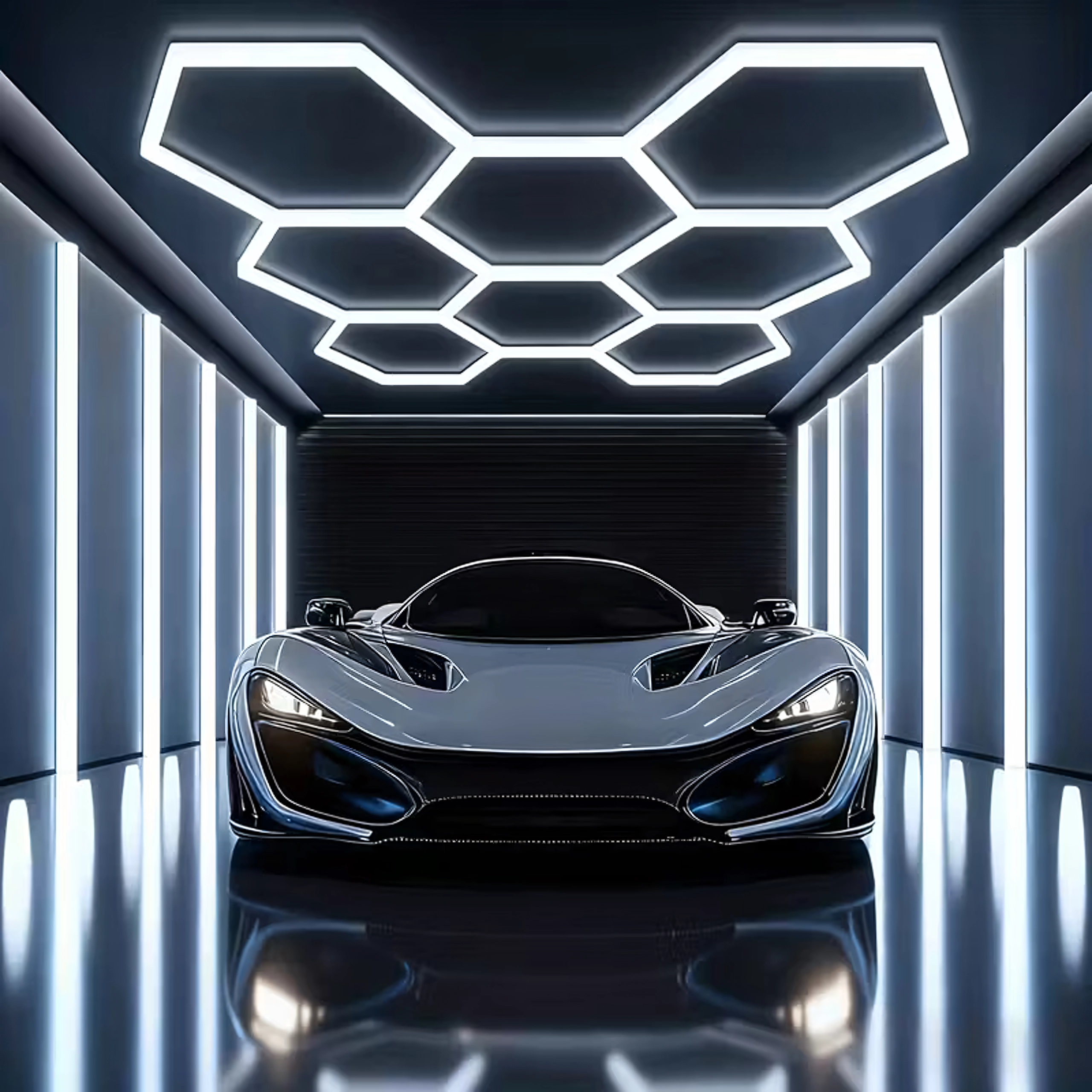 Det hexagonale LED-panel består af en modulær konstruktion, der danner et iøjnefaldende bikubeinspireret mønster. Med en høj effekt på 280 W og kold farvetemperatur på 6500K leverer det markant, rent og jævnt lys til arbejde og præsentation af køretøjer, produkter eller interiører. Et ideelt valg til garager, detailingbokse, showrooms, kontorer og moderne hjem.