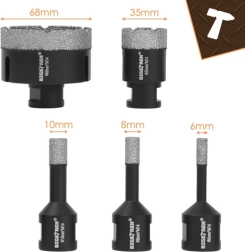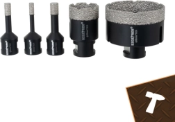 Fem af de mest anvendte diametre (6/8/10/35/68 mm) dækker installations- og flisearbejde. Den medfølgende adapter muliggør brug med boremaskine.