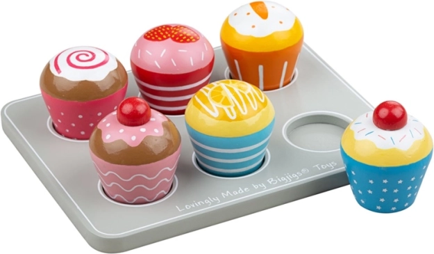 Giv børnene glæden ved kreativ leg med BIGJIGS TOYS træmuffins. Sættet indeholder seks lækkert udseende stykker inklusive bakke, så de altid er klar til servering. Hver muffin har unikt pynt, som indbyder til kombinations- og rollelege i legekøkkenet eller butikken.