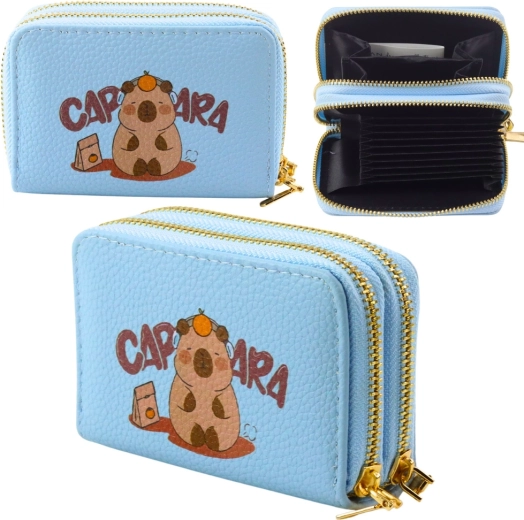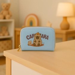 Denne lyseblå pung kombinerer et legende kapybara-design med praktisk organisering. To gyldne lynlåse adskiller opbevaringen, så du nemt kan sortere kort, kontanter, mønter og kvitteringer. Den indvendige harmonika-konstruktion giver hurtigt overblik og bekvem adgang.