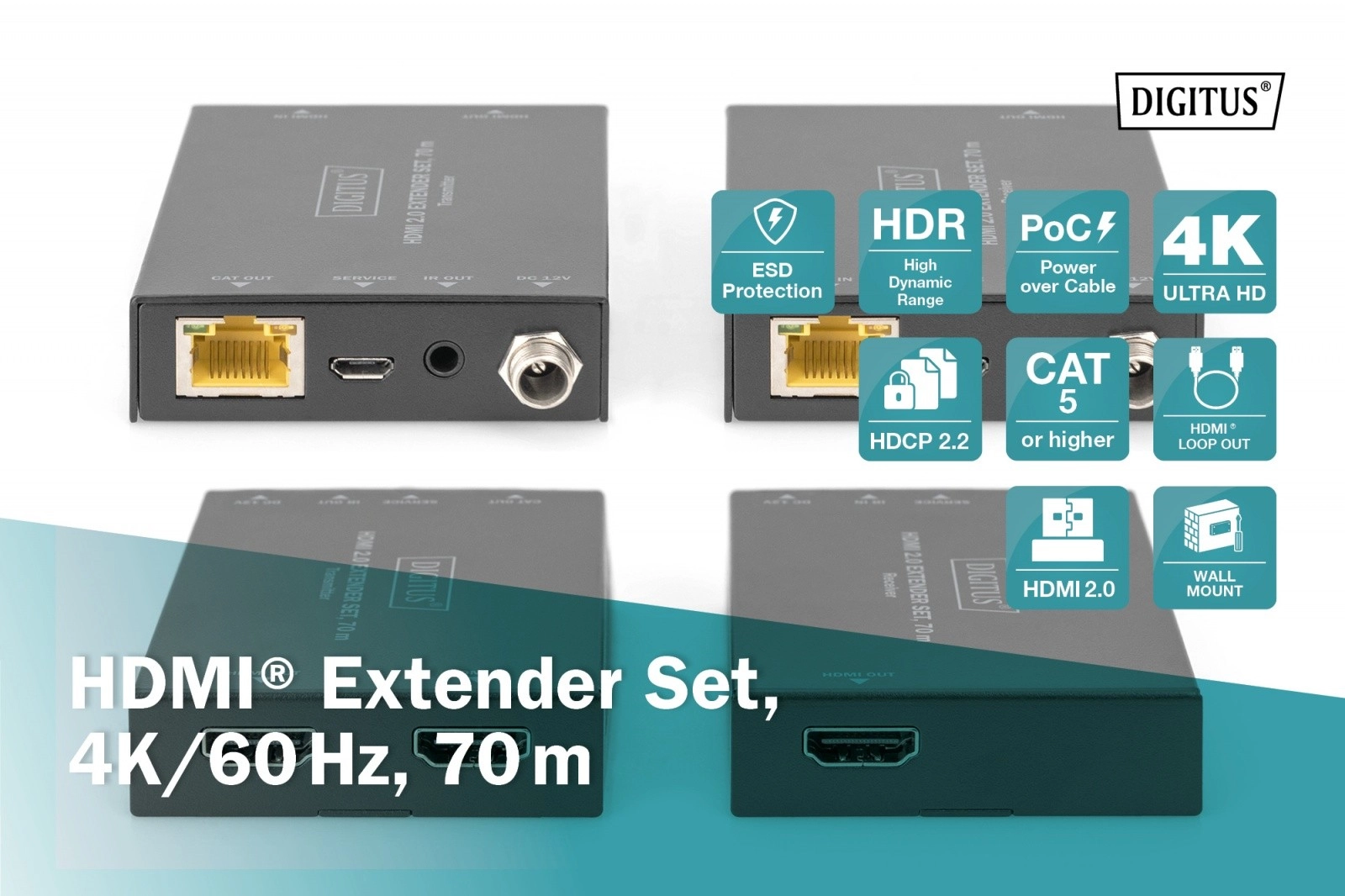 - Lang rækkevidde: op til 70 m (4K 30 Hz op til 70 m, 4K 60 Hz op til 60 m)