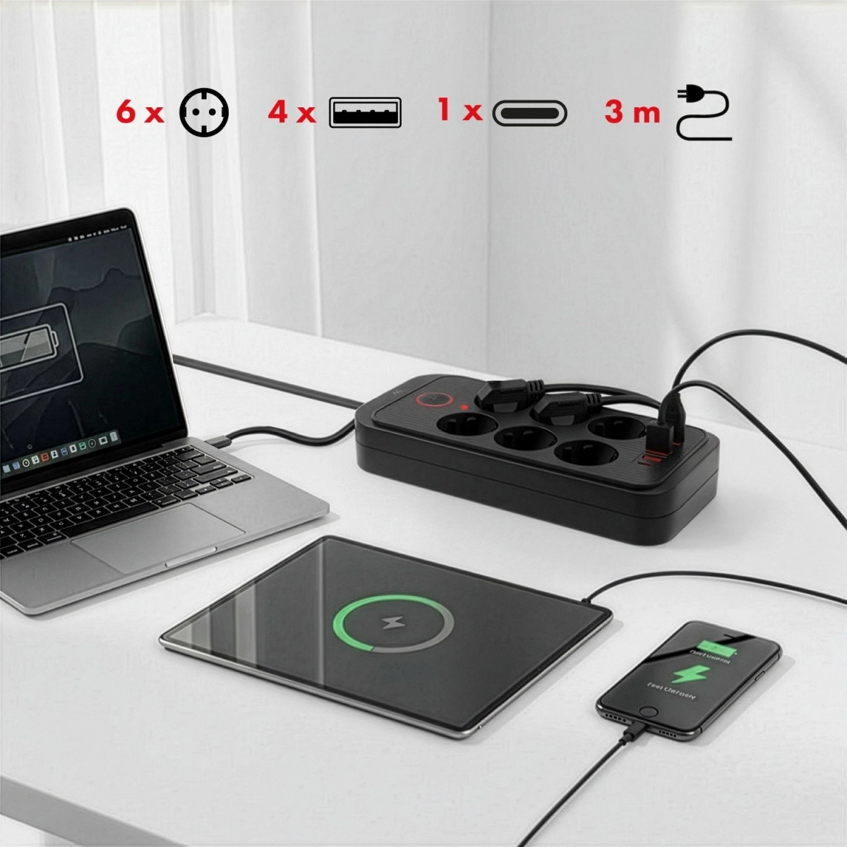Denne smarte strømliste kombinerer klassiske stikdåser med kraftig USB-opladning. Den giver sikker og bekvem tilslutning til computere, skærme, printere og gamingtilbehør og oplader samtidig hurtigt telefon, tablet eller høretelefoner via USB-A og USB-C.