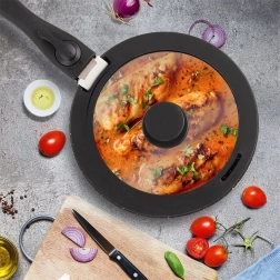 Det robuste glas gør det muligt at følge madlavningen, og det langsgående udluftningshul giver sikker dampudslip og gør det lettere at hælde væsker fra.