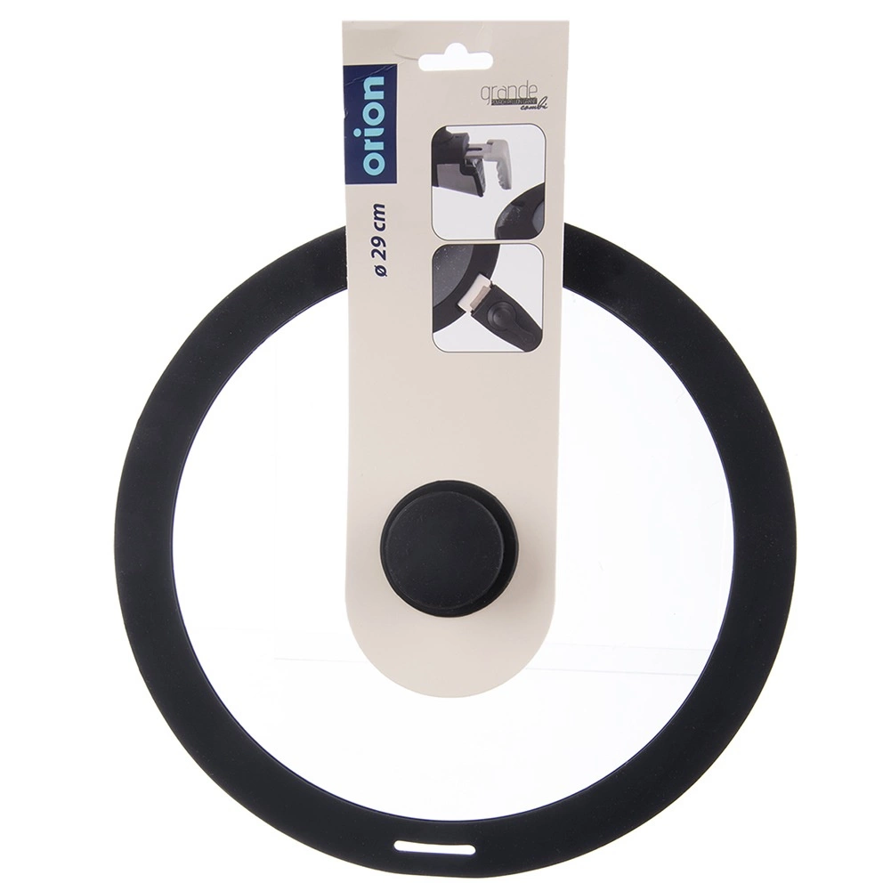 Universelt glaslåg med en diameter på 29 cm med bred silikonekant til kogegrej på 28 cm. Tilbyder sikker og tæt pasform, holdbart borosilikatglas, langsgående damphul og praktisk udsparing til aftageligt håndtag. Velegnet til kogning, simring og bagning op til 220 °C, kan vaskes i opvaskemaskine.