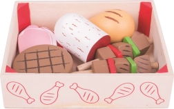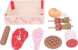 Denne kvalitets trækasse er fyldt med “kødfulde” specialiteter, som børn kender fra køkkenet. De finder bacon, bøf, pølse, kylling og andre stykker, som de nemt kan bruge til at tilberede en fest for hele familien. Efter legen ryddes alt tilbage i den praktiske boks – orden på ingen tid.