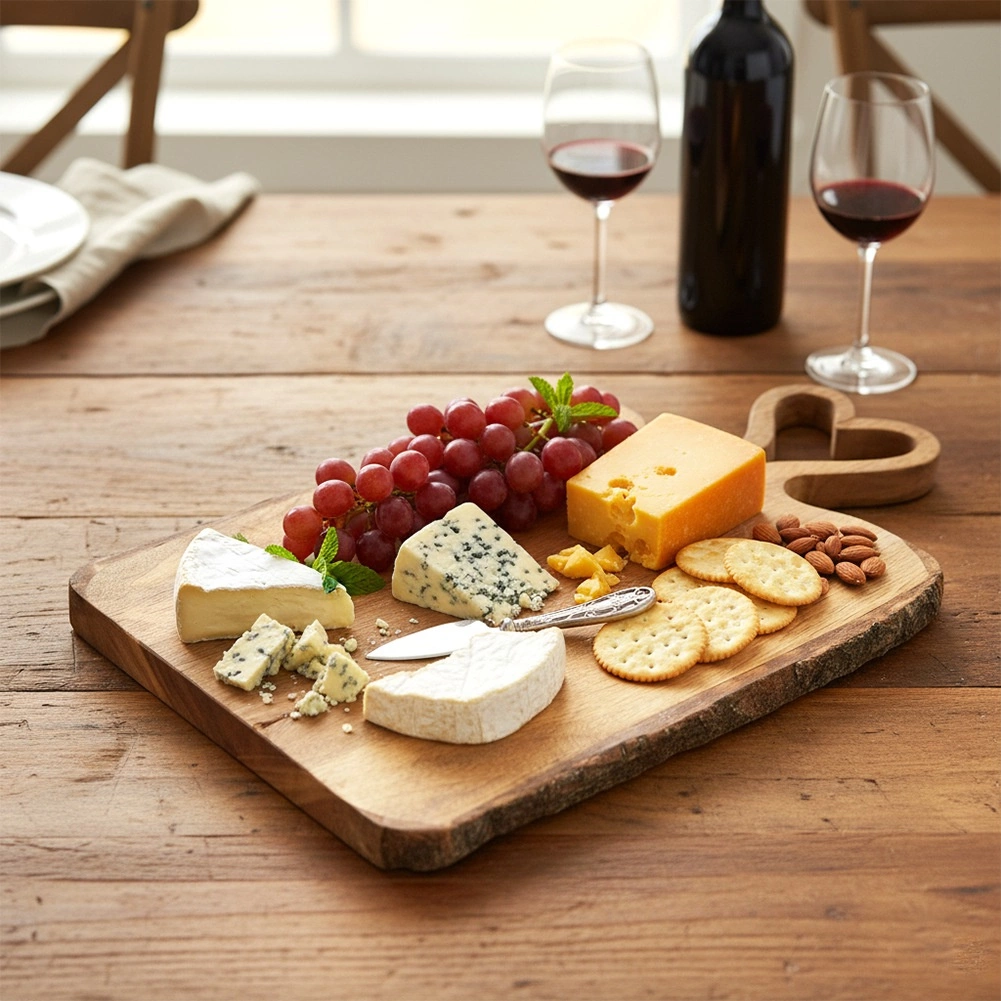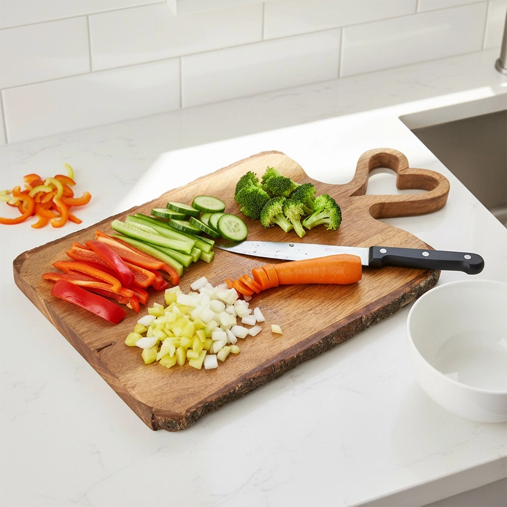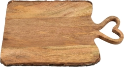 Stilfuldt skærebræt i mangotræ med hjerteformet greb, ideelt til både skæring og servering af oste, pålæg og snacks. Mål 45 × 25 × 2 cm, solid konstruktion, modstandsdygtigt over for fugt og lugte. Originalt produkt fra ORION.