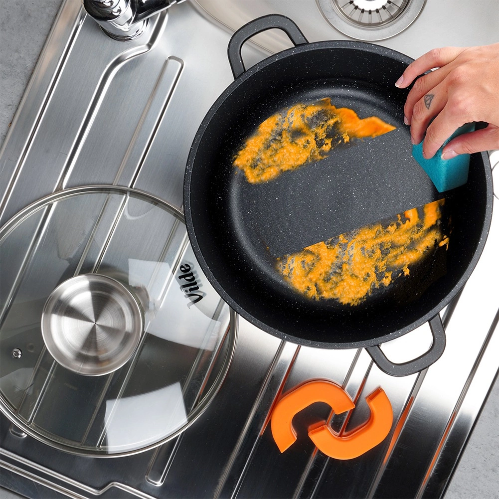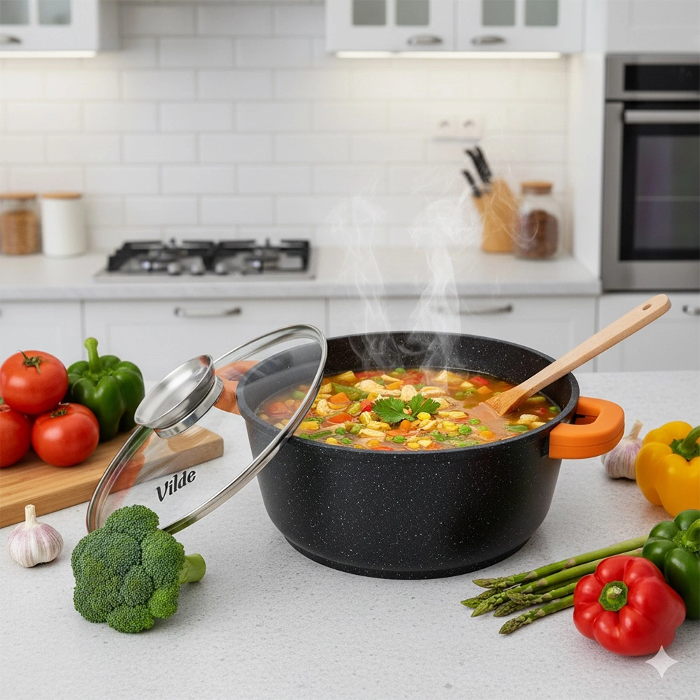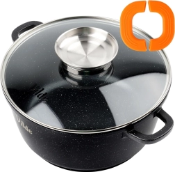 To robuste sidegreb med silikoneovertræk giver tryghed og komfort ved transport, selv når gryden er varm. Takket være alsidig anvendelse er den ideel til supper, braisering af kød, gullash, ovnretter og one-pot måltider – og du kan servere direkte fra gryden med stil.