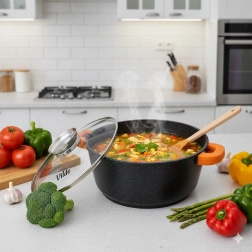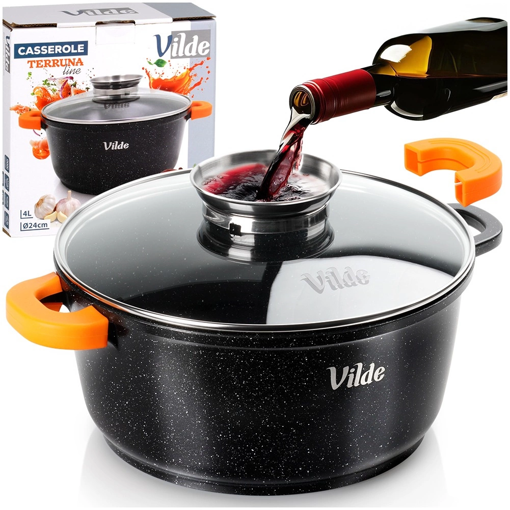 Oplev den praktiske VILDE-gryde fra TERRUNA AROMA-serien, som kombinerer en robust støbt aluminiums-krop med en non-stick granitbelægning for sundere madlavning. Glaslåget med bredt greb i rustfrit stål og dosering gør det muligt at tilsætte vin, vand eller fond uden at løfte låget, så retten bevarer både temperatur og aroma.