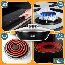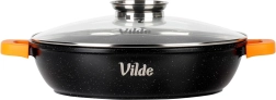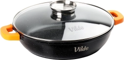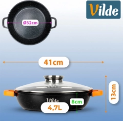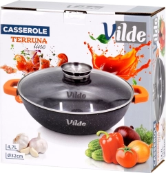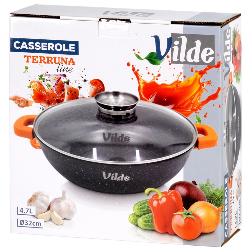 I pakken finder du: pande 32 cm, glaslåg med dispenser, orange silikoneovertræk til håndtag. Originalt produkt fra Vilde – TERRUNA AROMA-serien, fremstillet i overensstemmelse med europæiske standarder.
