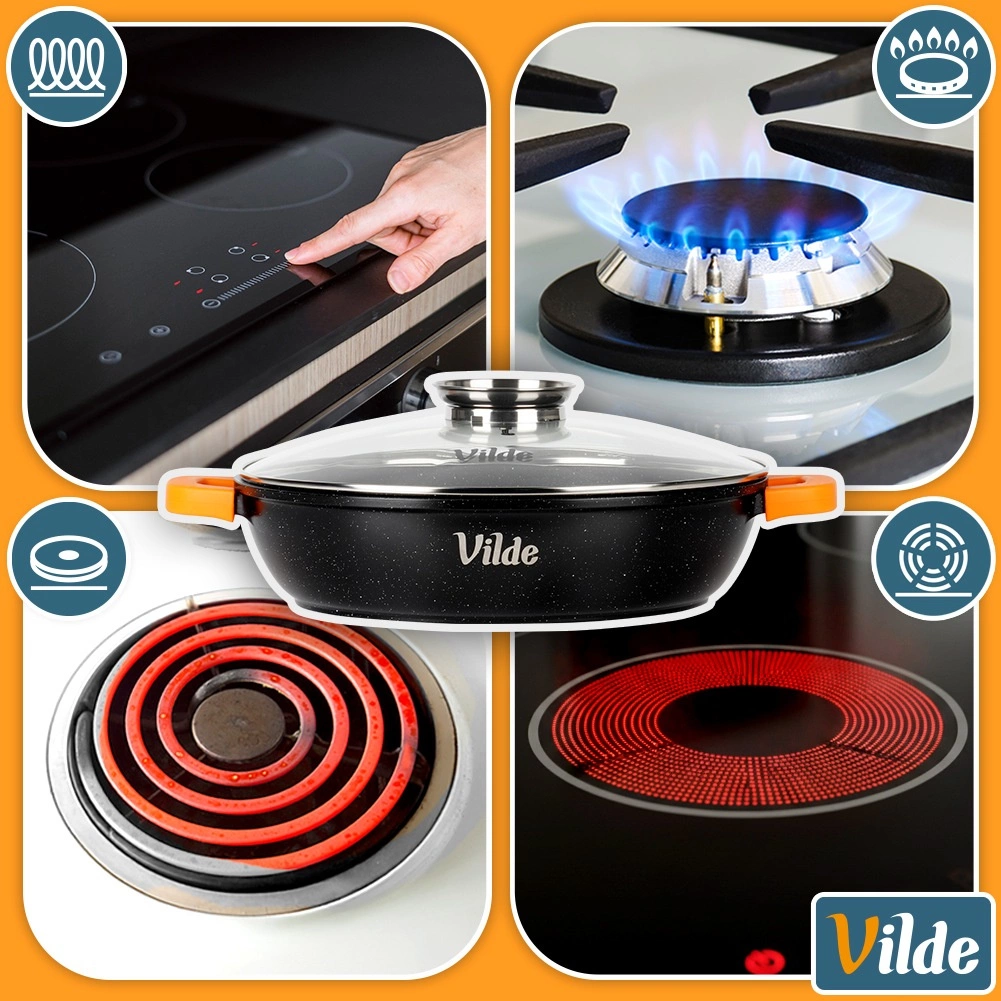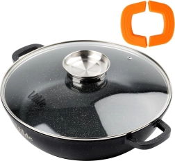 Den massive aluminiumsstøbning med granit non-stick-belægning sikrer jævn varmefordeling og nem rengøring. De to robuste håndtag med skridfaste silikoneovertræk giver et sikkert greb selv ved høje temperaturer. Pandens kompatibel med gas-, el-, glaskeramiske og induktionskogeplader og kan også bruges i ovn op til 200 °C (uden låg). Tåler opvaskemaskine.