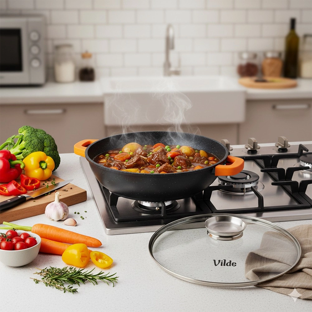 Den dybe pande Vilde fra TERRUNA AROMA-serien er ideel til stegning, sautering og gratinering. Det rummelige volumen på 4,7 l og diameteren på 32 cm gør den til et fremragende valg til one-pan-retter, gullasch, saucer, pasta og grøntsagsblandinger. Glaslåget med bredt greb i rustfrit stål fungerer samtidig som en dispenser til flydende ingredienser – du kan hælde væske på uden at løfte låget.