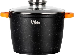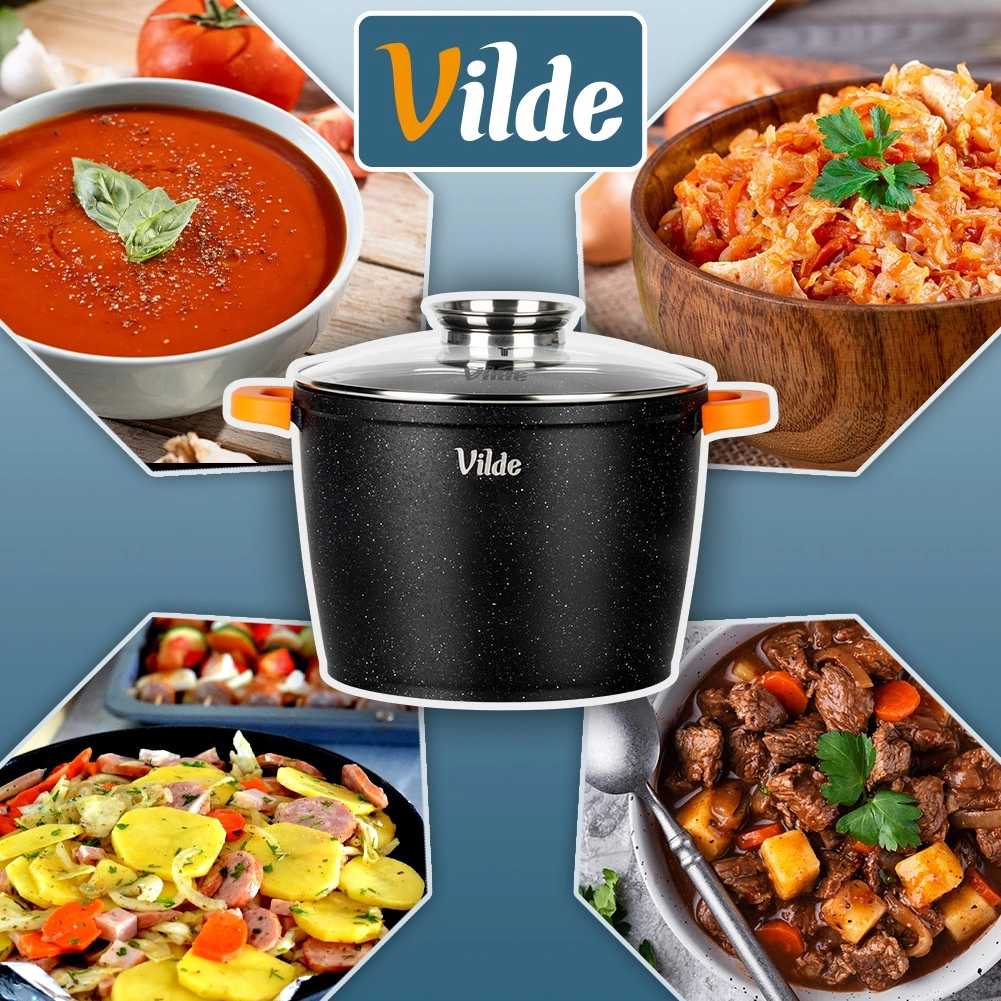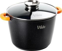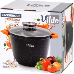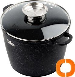 Den rummelige granitgryde Vilde TERRUNA AROMA med en kapacitet på 6,7 l og en diameter på 24 cm er ideel til supper, gullascher og braisering af kød. Takket være den non-stick granitbelægning tilbereder du med minimalt fedt, glaslåg med doseringsåbning gør det muligt at hælde væske i uden at løfte låget, og silikone skridsikre overtræk på håndtagene sikrer et sikkert greb. Velegnet til gas, el, keramik og induktion, ovnfast op til 200 °C (uden låg) og kan gå i opvaskemaskinen.