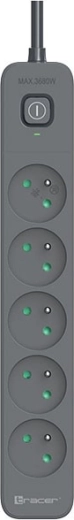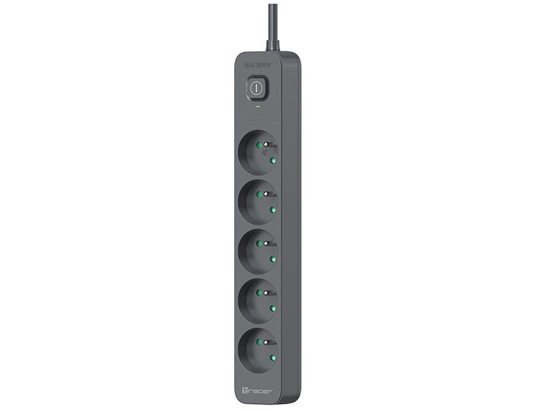 Pålidelig overspændingsbeskyttelse til hjemmeelektronik. TRACER Power Line+ tilbyder 5 jordede stik, 1,8 m kabel, maks. effekt 3680 W og automatisk sikring med baggrundsbelyst kontakt for enkel og sikker brug.