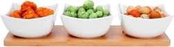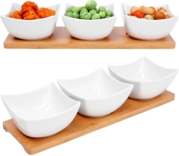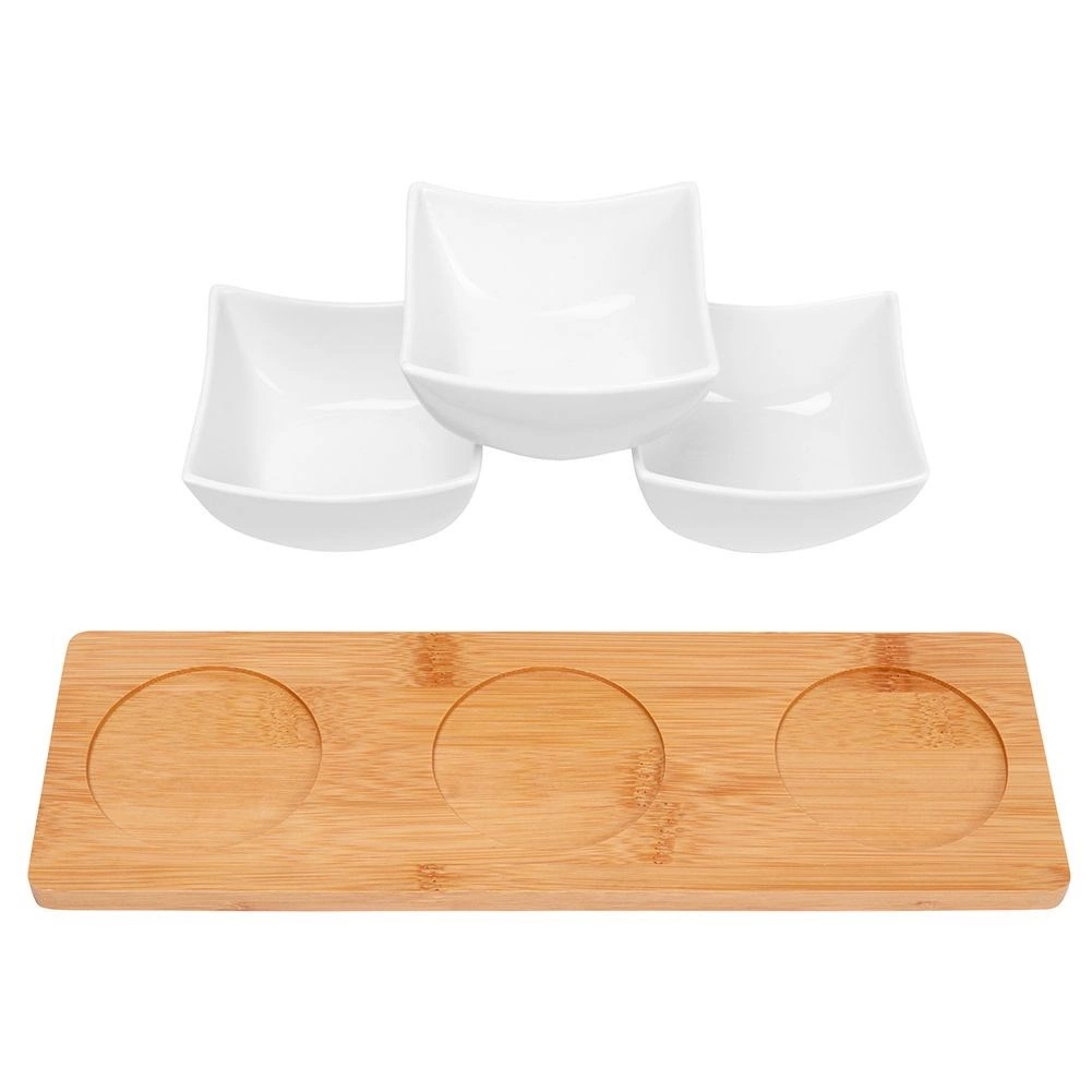 Dette 4-delte sæt kombinerer minimalistisk design med funktionalitet. Tre hvide porcelænsskåle er placeret på en solid bambusbakke med fræsede fordybninger, som forhindrer skålene i at glide under servering og transport. Perfekt til både hjemmet og professionel catering.
