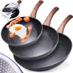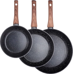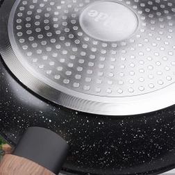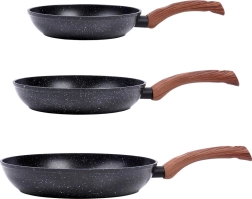 Stilfuldt sæt med tre pander i størrelserne 20, 24 og 28 cm med en robust granit nonstick-belægning, jævn varmefordeling og ergonomiske greb med trælook. Velegnet til alle komfurtyper inkl. induktion, nemme at rengøre og kan tåle opvaskemaskine. Ideel til sund madlavning med minimalt fedt samt daglig stegning og sautering.