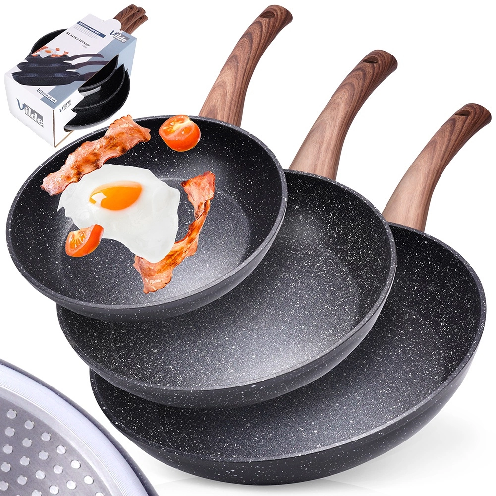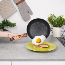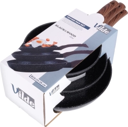 BLACK&WOOD-pandesættet kombinerer moderne look med praktisk funktion i ethvert køkken. Tre alsidige størrelser (20/24/28 cm) dækker hurtige morgenmåltider, frokoster og familiemiddage. Den robuste granit nonstick-belægning sikrer nem frigivelse af retter, mindre fastbrænding og lettere vedligeholdelse.