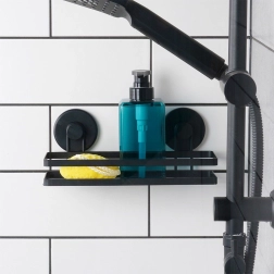 Elegant metalhylde til brusen i moderne sort hjælper med at holde dit badeværelse ryddeligt og rent. Takket være sugekopperne kan den nemt fastgøres på glatte overflader som fliser eller glas, uden boring og uden at beskadige vægge. Den åbne gitterkonstruktion sikrer vandafledning og hurtig tørring.