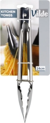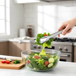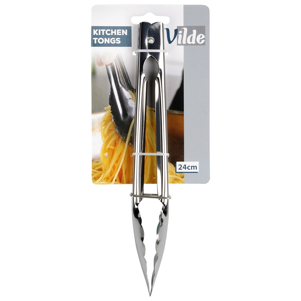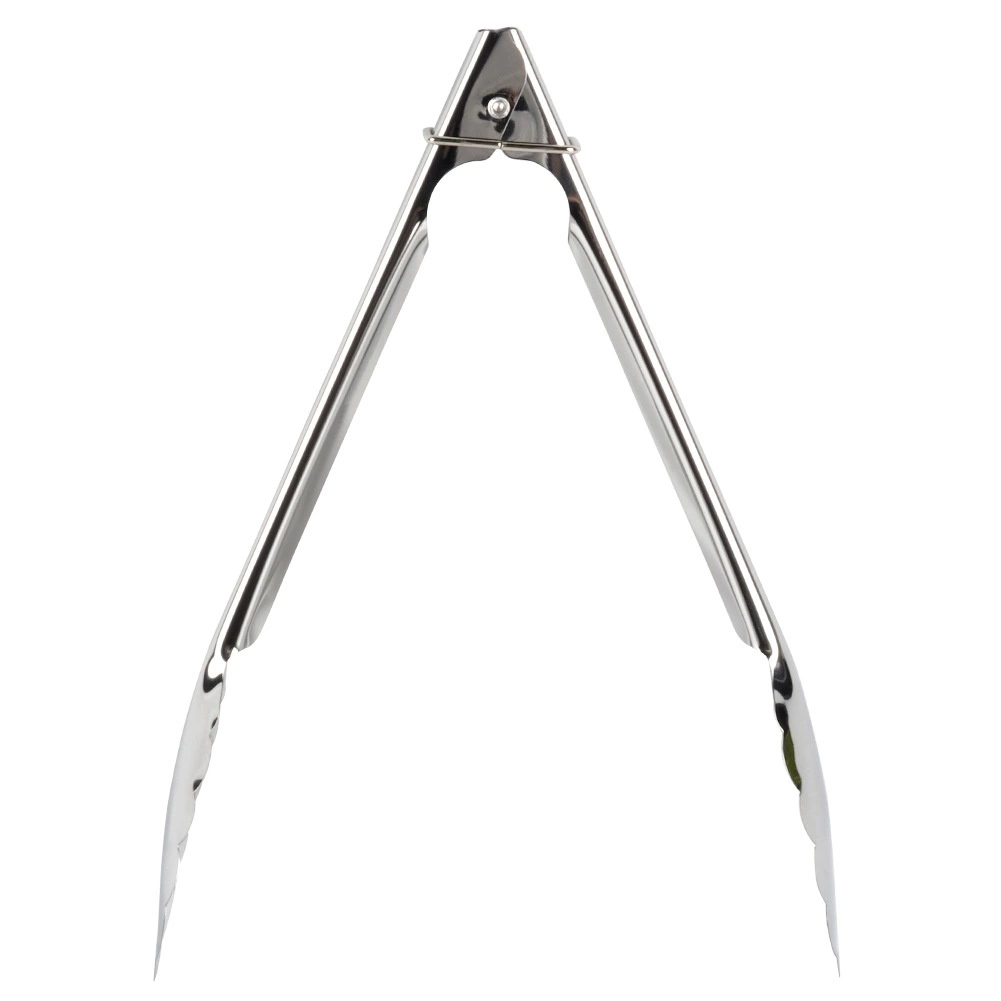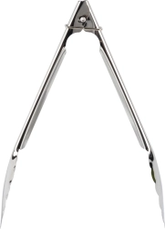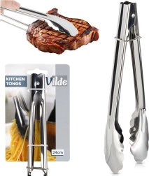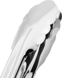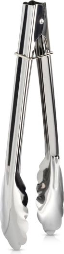 Alsidige køkkentænger i rustfrit stål kendetegnet ved styrke, holdbarhed og behagelig håndtering. De riflede kæber griber sikkert kød, grøntsager og brød uden at beskadige overfladen. Velegnet til servering af salater, vending af bøffer på panden og arbejde ved grillen.