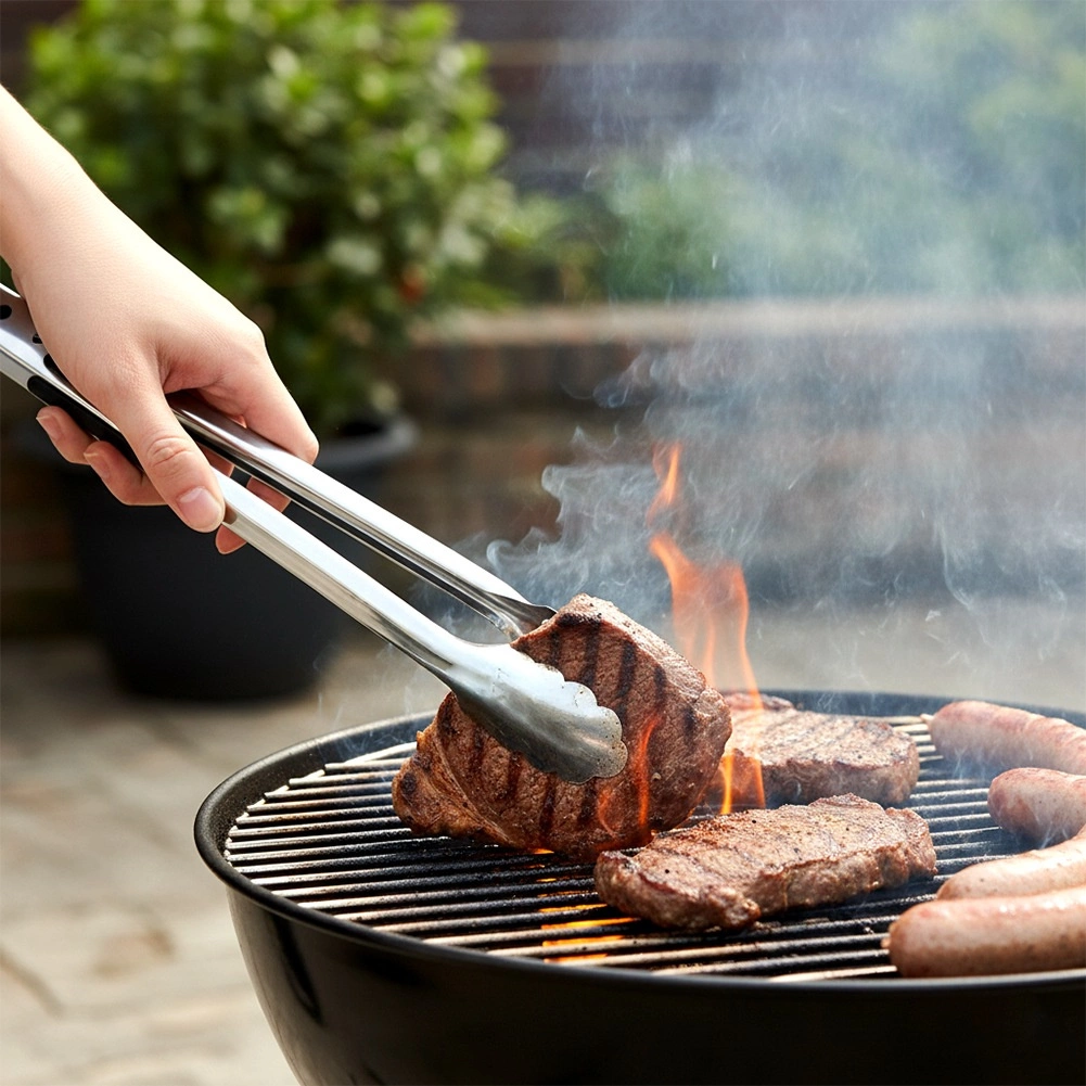 De riflede ender i rustfrit stål griber sikkert om bøffer, grøntsager og brød uden at glide – ideelle til pander, bageplader og grill.