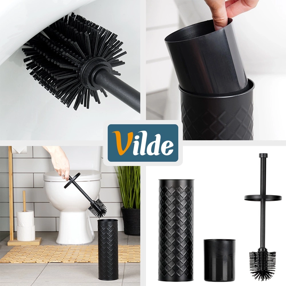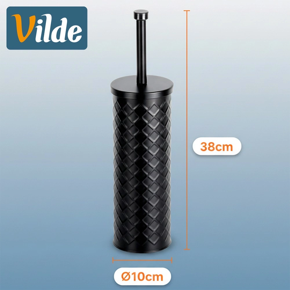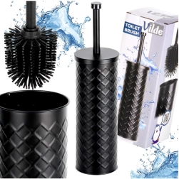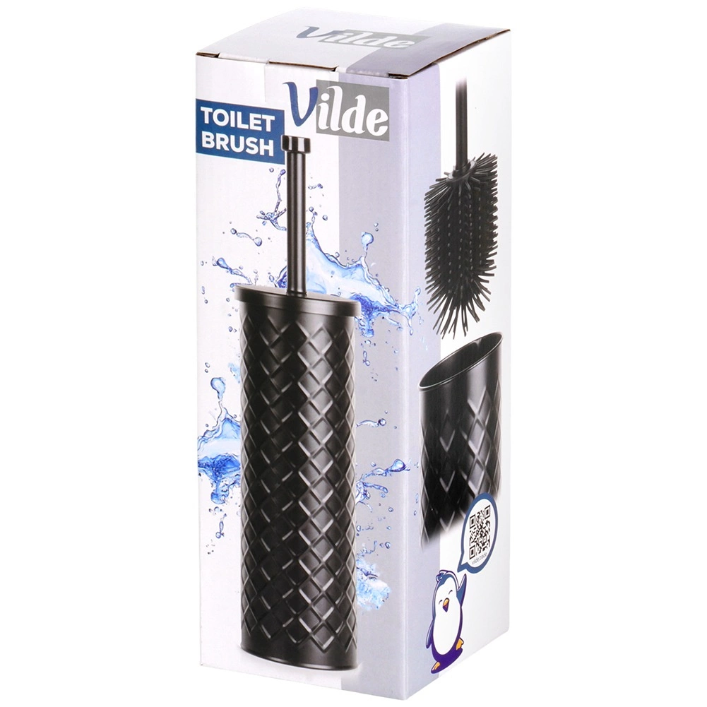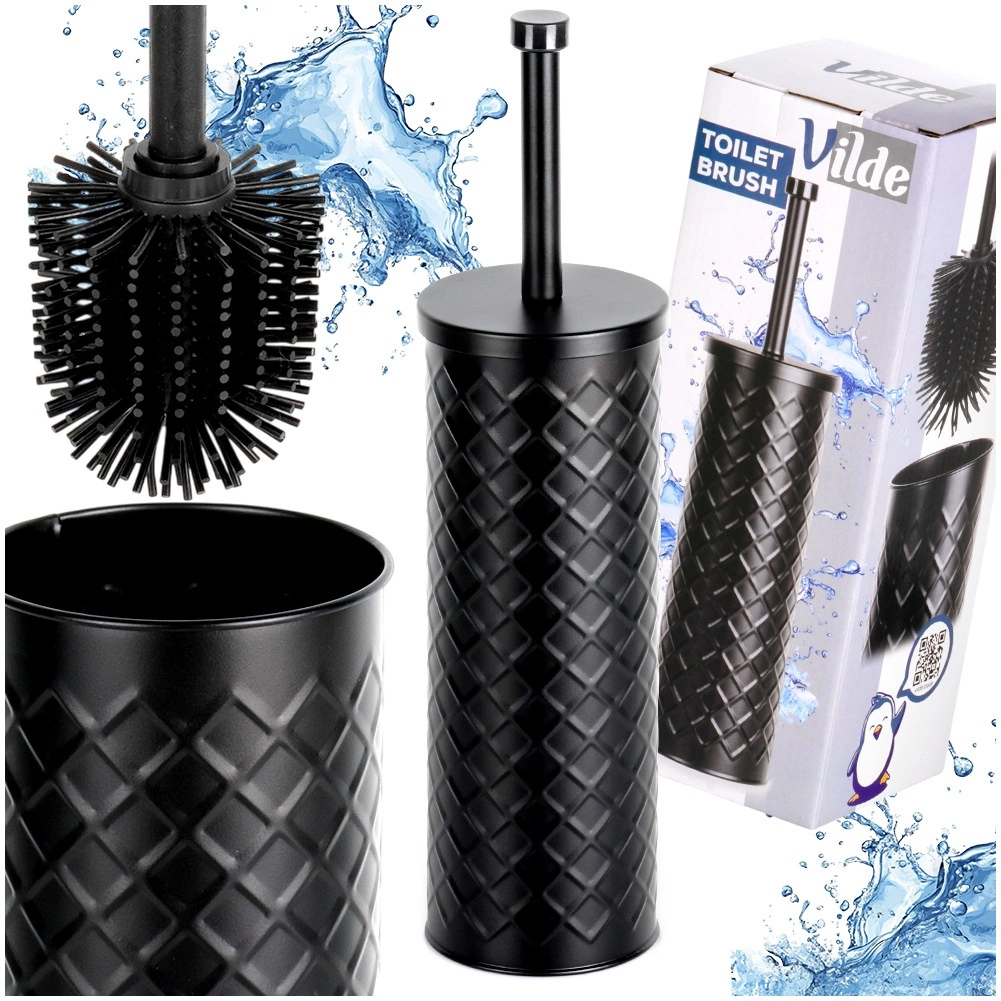 Elegant silikon-WC-børste med metalstativ i mat sort for hygiejnisk og diskret vedligeholdelse af toilettet. Den lukkede holder med drypbakke sikrer ren og tør opbevaring, og det silikonebelagte hoved skylles let af og suger ikke snavs til sig. Stabil metalbeholder med reliefmønster og behageligt langt håndtag til hygiejnisk rengøring. Klassisk og moderne design passer perfekt i enhver badeværelse.