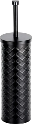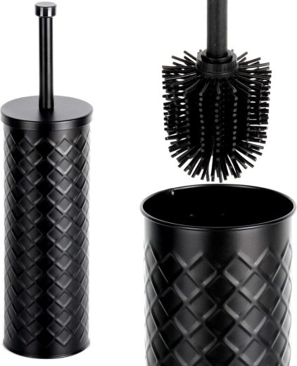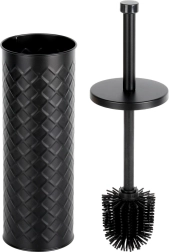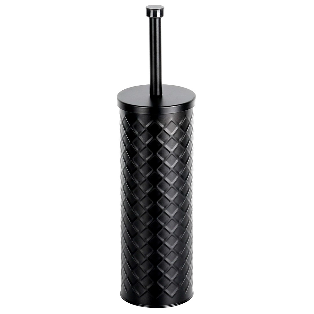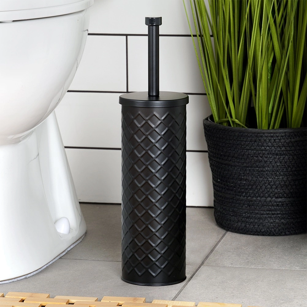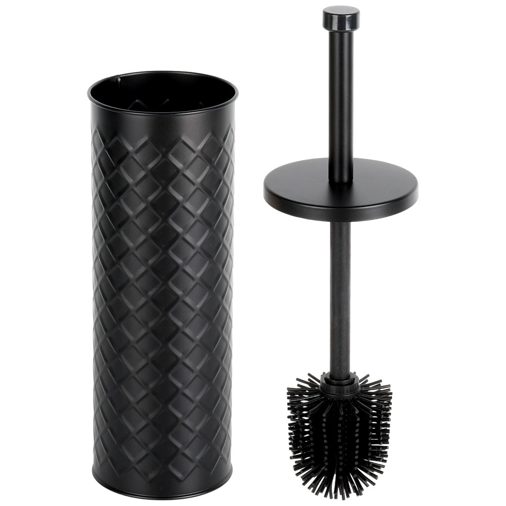 Elegant silikon-WC-børste med metalstativ i mat sort for hygiejnisk og diskret vedligeholdelse af toilettet. Den lukkede holder med drypbakke sikrer ren og tør opbevaring, og det silikonebelagte hoved skylles let af og suger ikke snavs til sig. Stabil metalbeholder med reliefmønster og behageligt langt håndtag til hygiejnisk rengøring. Klassisk og moderne design passer perfekt i enhver badeværelse.