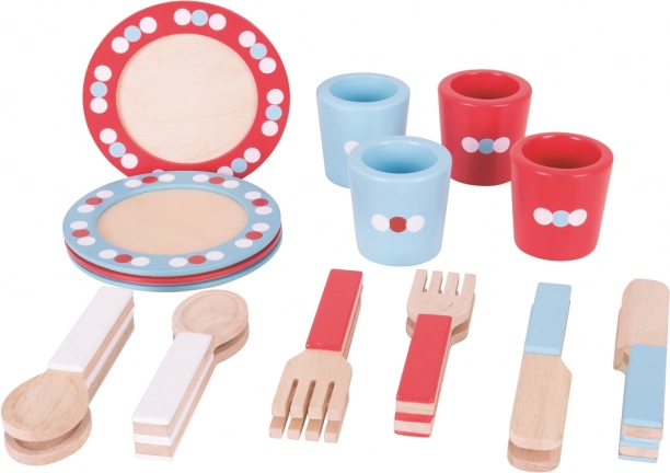 Dette farverige træspisesæt er designet til spirende unge kokke, der vil tilberede deres egne middage og arrangere teselskaber. Et perfekt tilbehør til ethvert legetrækkøkken, sættet indeholder: