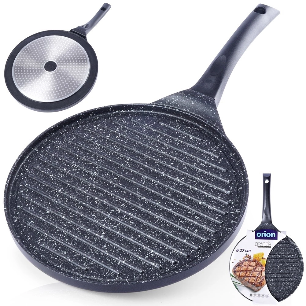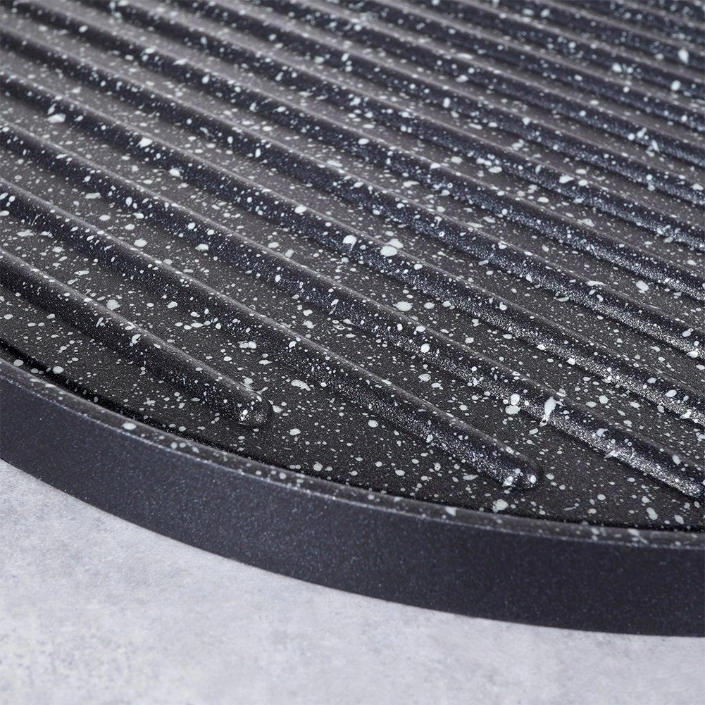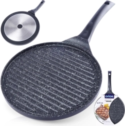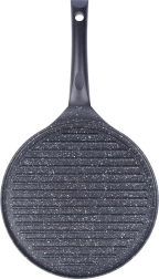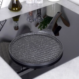 Denne grillpande i støbt aluminium med slidstærk granit non-stick belægning uden PFOA er skabt til daglig brug og mere krævende grillning. Den riflede overflade leder overskydende fedt væk og giver intens varmekontakt til saftige steaks, grøntsager og burgere. Den kraftige bund akkumulerer varmen hurtigt og fordeler den jævnt over hele fladen.