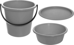 Dette 3-delte sæt kombinerer en stor spand (13 l), en kompakt skål (5 l) og et præcist tilpasset låg, som kan bruges på både spanden og skålen. Dermed får du en alsidig løsning til rengøring, vask, iblødsætning og transport af væsker uden risiko for spild. Den holdbare plast i grå farve er nem at vedligeholde og behageligt let til daglig brug.