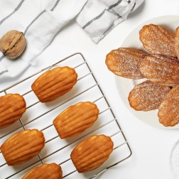 Efter bagning afkøles madeleinekagerne på en rist for perfekt tekstur og sprødhed uden kondens.