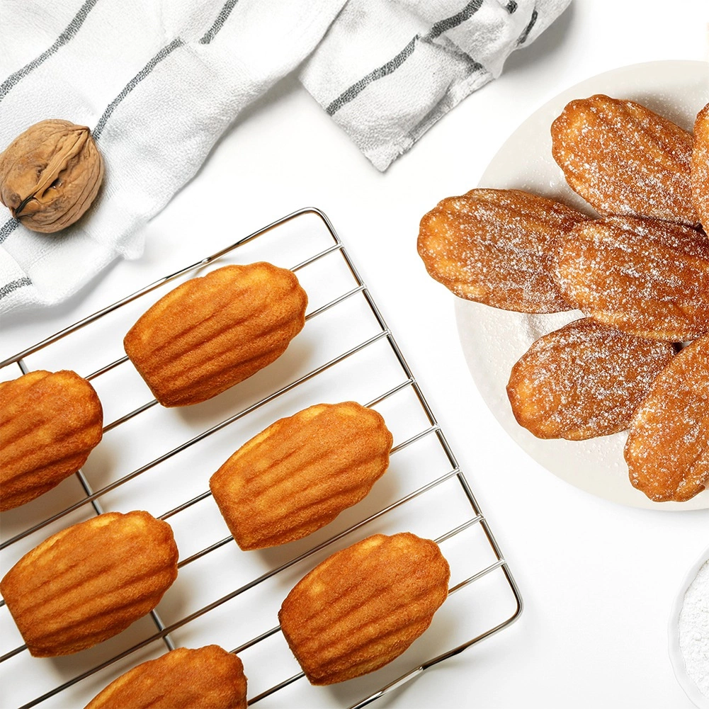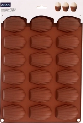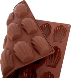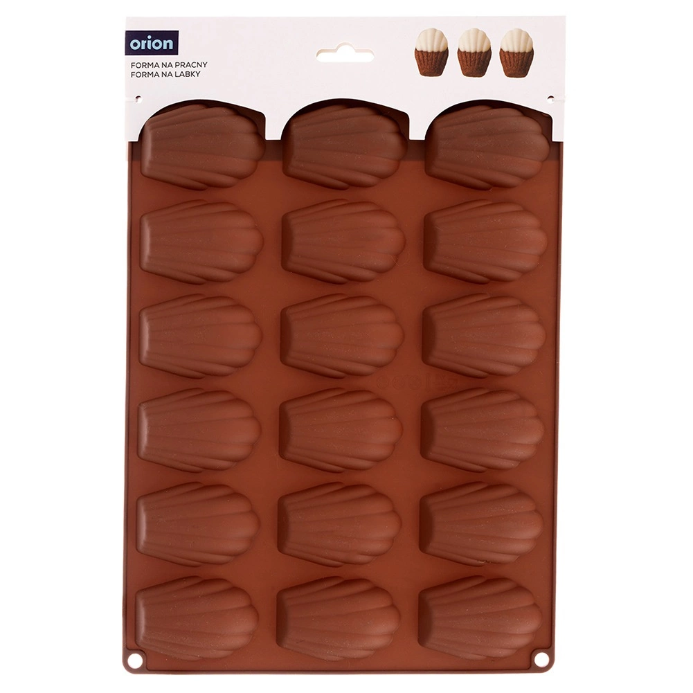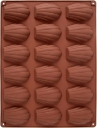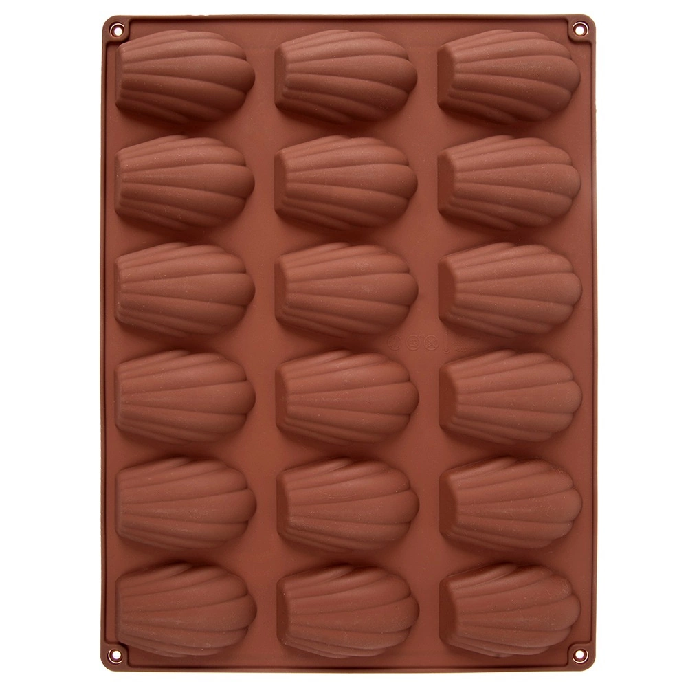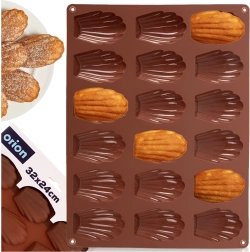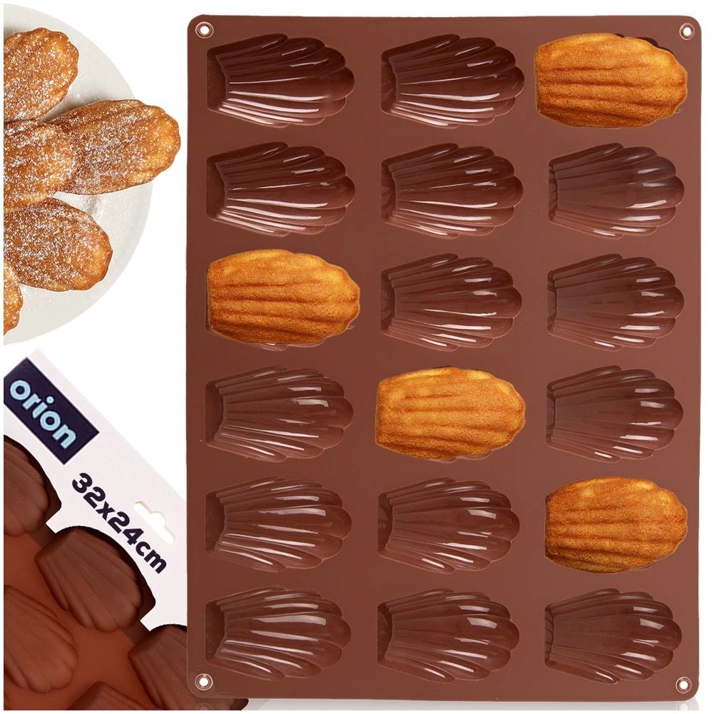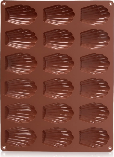 Denne brune silikoneform er ideel til hjemmebagte madeleiner, mini-kager samt til at lave praliner og chokolader i muslingeform. Formens mål 32 × 24,5 × 2 cm rummer 18 hulrum, hver på cirka 7 × 4,5 cm. Absorberer ikke lugt eller smag, leder varme godt, og takket være fleksibiliteten kan desserter nemt tages ud uden at smøre formen.