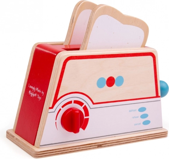 Læg brødskiverne i sprækkerne, indstil den ønskede ”bruning” og tryk på løftestangen – efter et øjeblik popper toasten op som på et rigtigt apparat. Markeringerne defrost, reheat, cancel understøtter efterligning af daglige aktiviteter og udvikler både ordforråd og fantasi.