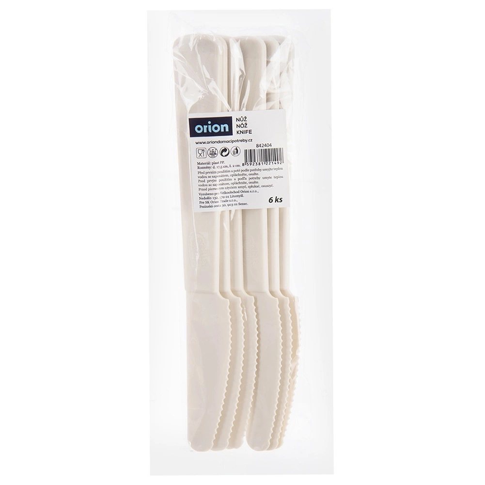 Praktisk sæt med seks lette og samtidig holdbare knive til daglig borddækning hjemme og udendørs. Takket være den let savtakkede kant skærer de sikkert brød, frugt og grøntsager. Cremefarven passer til enhver opdækning, den sikre form giver behagelig brug, og opvaskemaskinesikker gør vedligeholdelsen nem. Originalt produkt fra det tjekkiske mærke ORION.