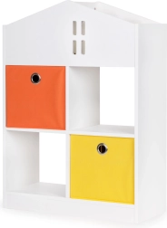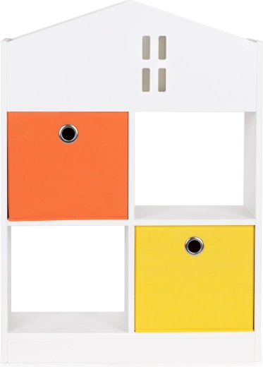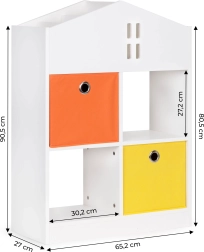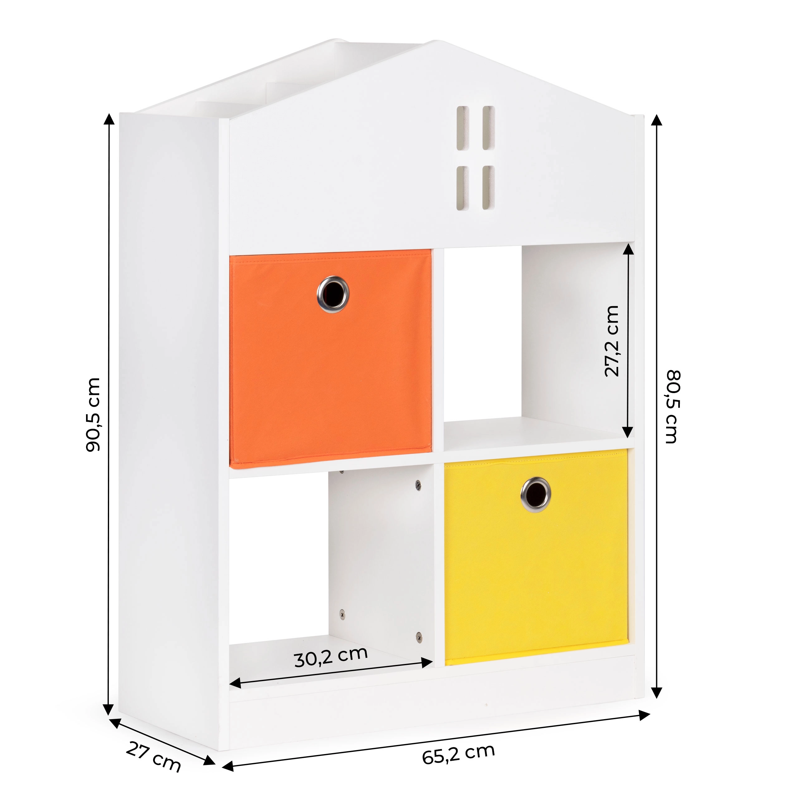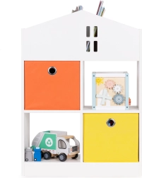 Denne børnebogreol i husform er ideel til opbevaring af bøger, legetøj og småting, som dit barn vil have lige ved hånden. Takket være fire rummelige hylder, praktiske rum og 2 stofkurve skaber du nemt et overskueligt system. Den rent hvide farve passer til enhver indretning – på børneværelset, i legerummet eller i venteområder.