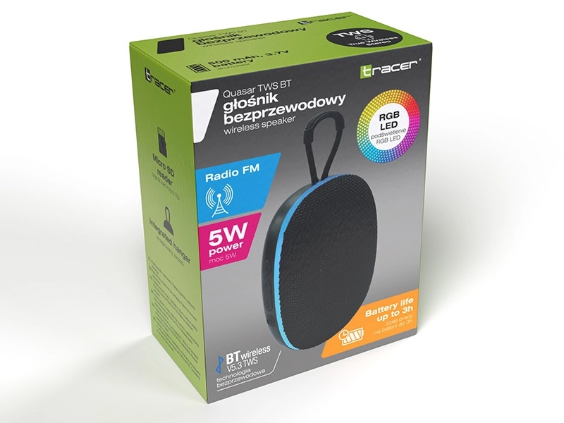 Den kompakte og lette højttaler TRACER Quasar TWS BT kan du tage med overalt. Den tilbyder Bluetooth 5.3 for stabil forbindelse, TWS-parring af to enheder for stereo, effekt på 5 W, op til 3 timers afspilning fra et 500 mAh-batteri, integreret FM-radio og afspilning fra microSD/USB – alt i et robust kabinet med praktisk håndstrop.