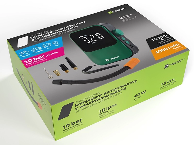 Leder du efter en pålidelig kompressor til turen? TRACER-kompressoren kombinerer høj ydeevne, enkel betjening og praktiske funktioner i én kompakt enhed. Takket være maks. tryk på 10 bar og luftflow på 18 l/min kan du hurtigt efterfylde bildæk og cykeldæk, sportsudstyr og oppustelige tilbehør.