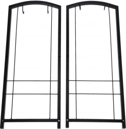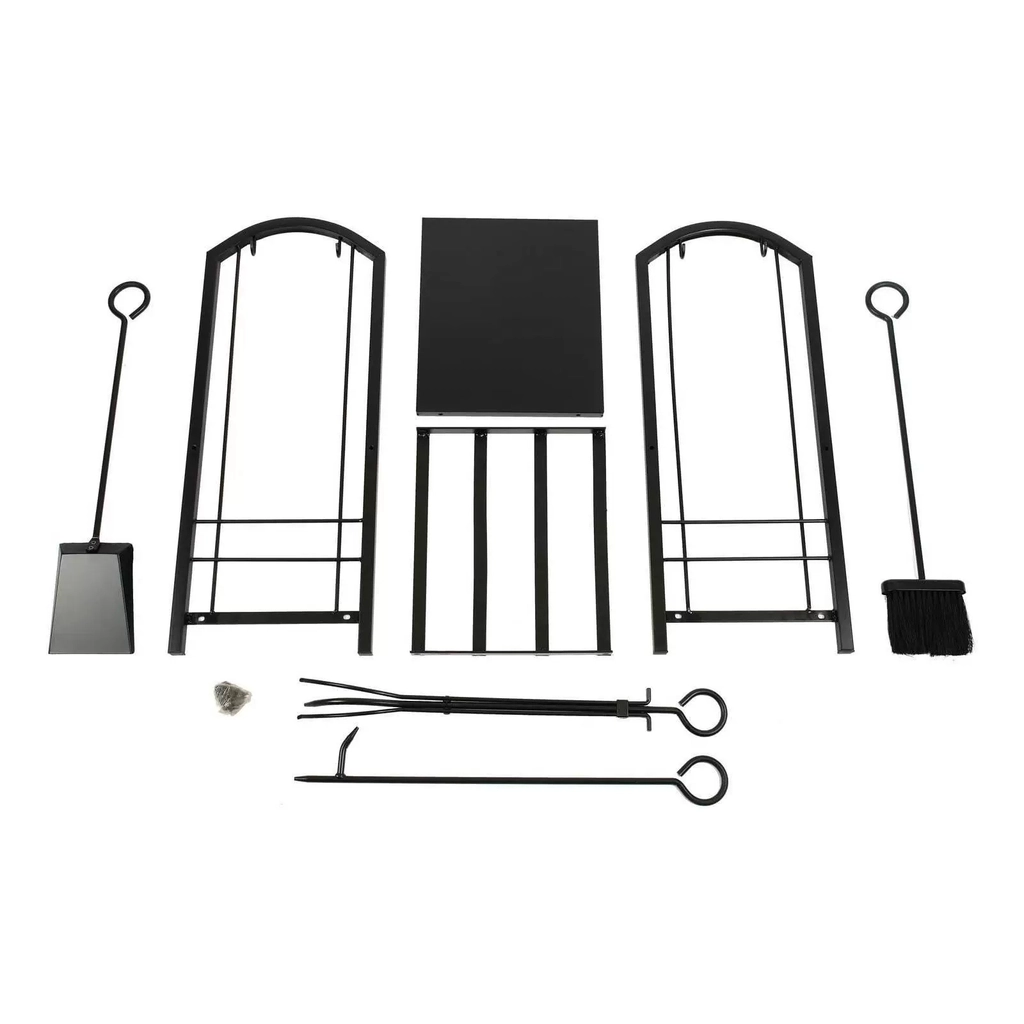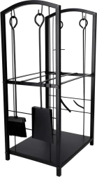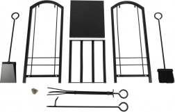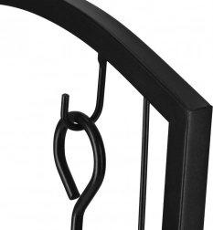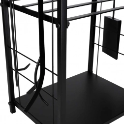På sidekrogene hænger det komplette pejseværktøj – ildrager, tang, skovl og børste – så både fyring og askerydning er hurtig og bekvem. Den åbne konstruktion med buede sider giver et let og elegant udtryk og passer til både moderne og rustikke interiører.