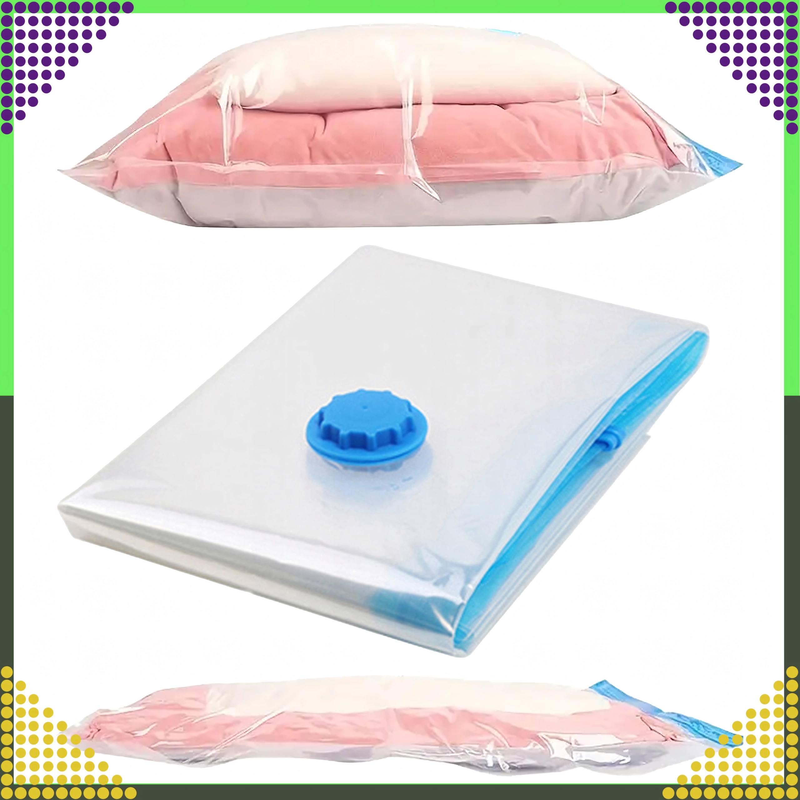 Spar plads og beskyt dine tekstiler med en praktisk vakuumpose i størrelsen 50 × 70 cm. Takket være hermetisk lukning, ventil til udsugning af luft og robust dobbelt lynlås forbliver dit tøj, dyner og puder rene, tørre og lugtfri. Ideel til sæsonopbevaring, spar op til 4× plads og er genanvendelig.