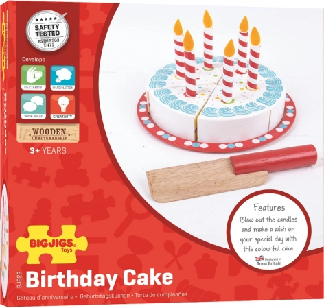 Oplev festens magi med vores træfødselsdagskage til at skære fra Bigjigs Toys. Denne legetøjskage er ideel til små børn, der lærer om verden omkring sig gennem sjov og interaktiv leg. Kagen er stor nok til en legetøjsgruppe på seks og inkluderer også en trækniv for nem udskæring.