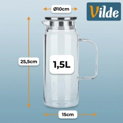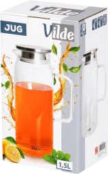 Elegant glaskande med en kapacitet på 1,5 l og rustfrit stållåg med si og tætning. Det robuste borosilikatglas tåler temperaturer fra -20 °C til 150 °C, låget op til 100 °C. Et praktisk dobbelt hældesystem holder frugt, is og krydderurter i kanden og gør serveringen ren og nem.