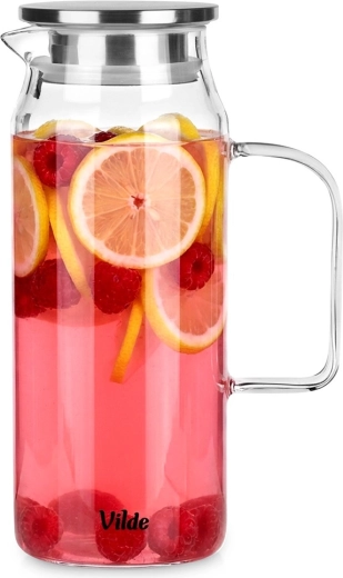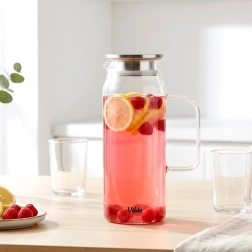 Den stilfulde glaskande er ideel til daglig servering af vand, lemonade, juice og iste. Det gennemsigtige design fremhæver smukt frugtskiver og urter, mens låget i rustfrit stål med si holder dem inde. Kanden passer til familiemiddage, havehygge og aftenservering.
