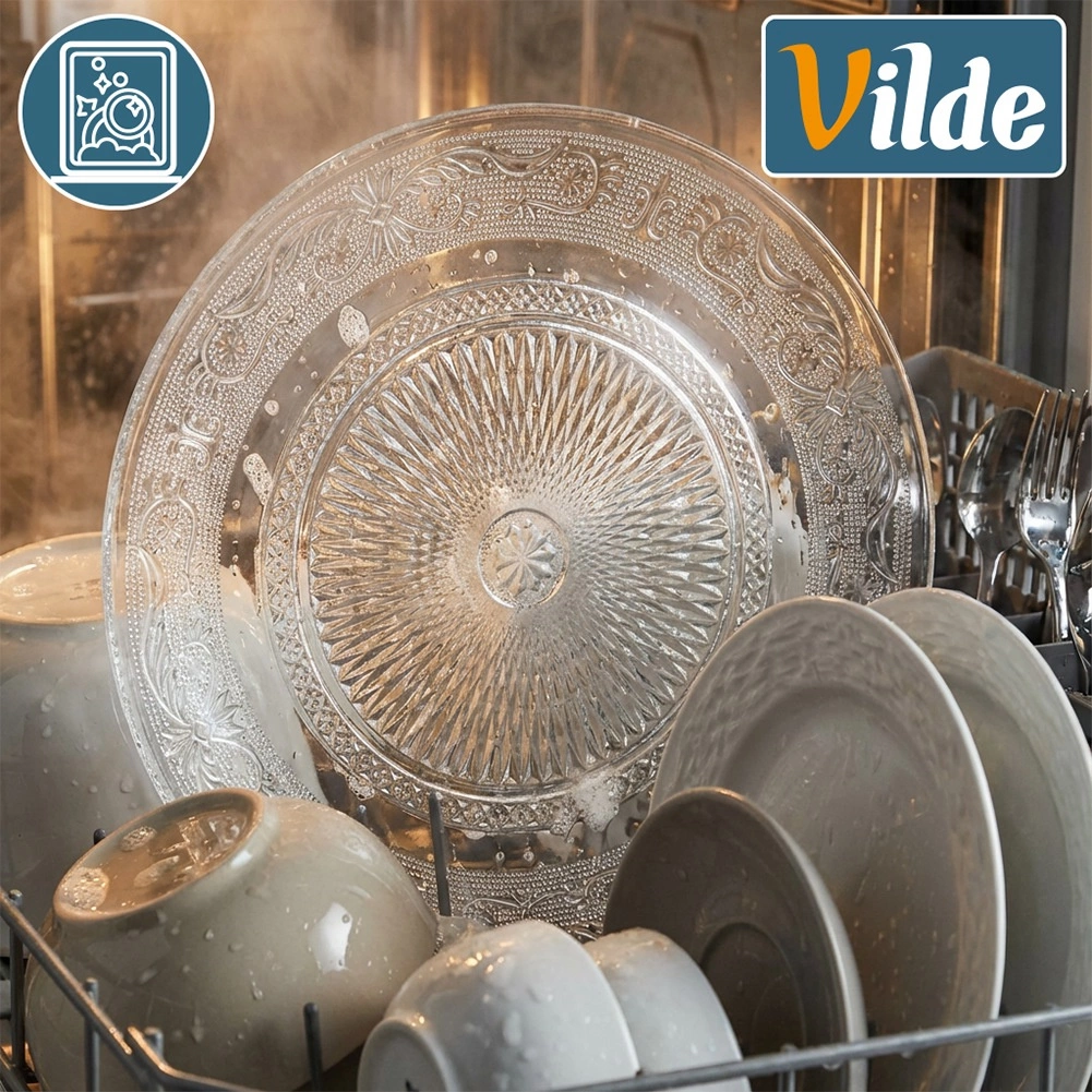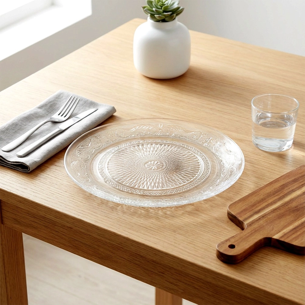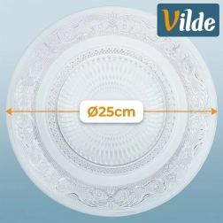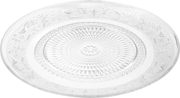 Elegant glasstallerken med en diameter på 25 cm og reliefdekoration, der minder om krystal. Alsidig og praktisk til både hverdag og festlig servering. Kan bruges som flad tallerken eller som fad til desserter og snacks. Tåler opvaskemaskine, kvalitetsklart glas, klassisk design og alsidig anvendelse i hjemmet og gastronomien.