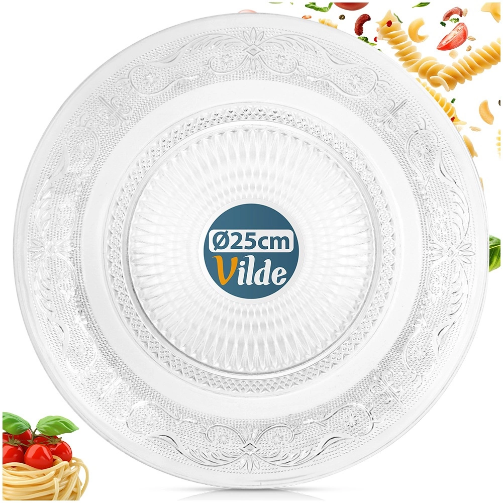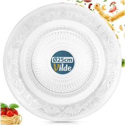 Opdag en stilfuld glasstallerken med en diameter på 25 cm og en højde på 2 cm, der kombinerer funktionalitet og æstetik. Takket være den effektfulde reliefdekoration ligner den krystal og fuldender enhver borddækning. Ideel til servering af hovedretter, søde desserter og salte lækkerier.